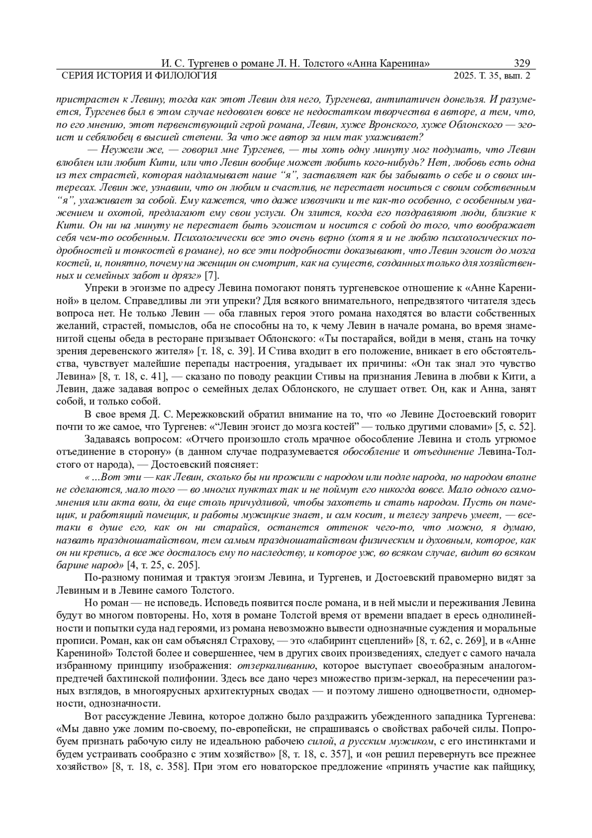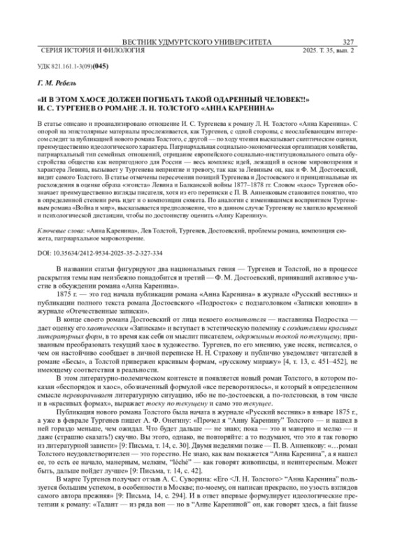 В статье описано и проанализировано отношение И. С. Тургенева к роману Л. Н. Толстого «Анна Каренина». С опорой на эпистолярные материалы прослеживается, как Тургенев, с одной стороны, с неослабевающим интересом следит за публикацией нового романа Толстого, с другой - по ходу чтения высказывает скептические оценки, преимущественно идеологического характера. Патриархальная социально-экономическая организация хозяйства, патриархальный тип семейных отношений, отрицание европейского социально-институционального опыта обустройства общества как непригодного для России - весь комплекс идей, лежащий в основе мировоззрения и характера Левина, вызывает у Тургенева неприятие и тревогу, так как за Левиным он, как и Ф. М. Достоевский, видит самого Толстого. В статье отмечены пересечения позиций Тургенева и Достоевского и принципиальные их расхождения в оценке образа «эгоиста» Левина и Балканской войны 1877-1878 гг. Словом «хаос» Тургенев обозначает преимущественно взгляды писателя, хотя из его переписки с П. В. Анненковым становится понятно, что в определенной степени речь идет и о композиции сюжета. По аналогии с изменившимся восприятием Тургеневым романа «Война и мир», высказывается предположение, что в данном случае Тургеневу не хватило временной и психологической дистанции, чтобы по достоинству оценить «Анну Каренину».