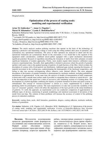 СОХРОКОВ А. М., ФИАПШЕВ А. Г., ХАМОКОВ М. М., ШЕКИХАЧЕВА Л. З. ОПТИМИЗАЦИЯ ПРОЦЕССА ДРАЖИРОВАНИЯ СЕМЯН: МОДЕЛИРОВАНИЕ И ЭКСПЕРИМЕНТАЛЬНАЯ ВЕРИФИКАЦИЯ // ИЗВЕСТИЯ КАБАРДИНО-БАЛКАРСКОГО ГОСУДАРСТВЕННОГО АГРАРНОГО УНИВЕРСИТЕТА ИМ. В. М. КОКОВА. 2025. № 2 (48)