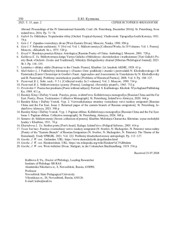 6. Куликова, Е. Ю. Стихотворная книга Юрия Галича “Орхидея”: экзотическое и традиционное / Е. Ю. Куликова // Сибирский филологический журнал. - 2023. - № 3. - С. 138-155. DOI: 10.17223/18137083/84/10 EDN: WQHWFM