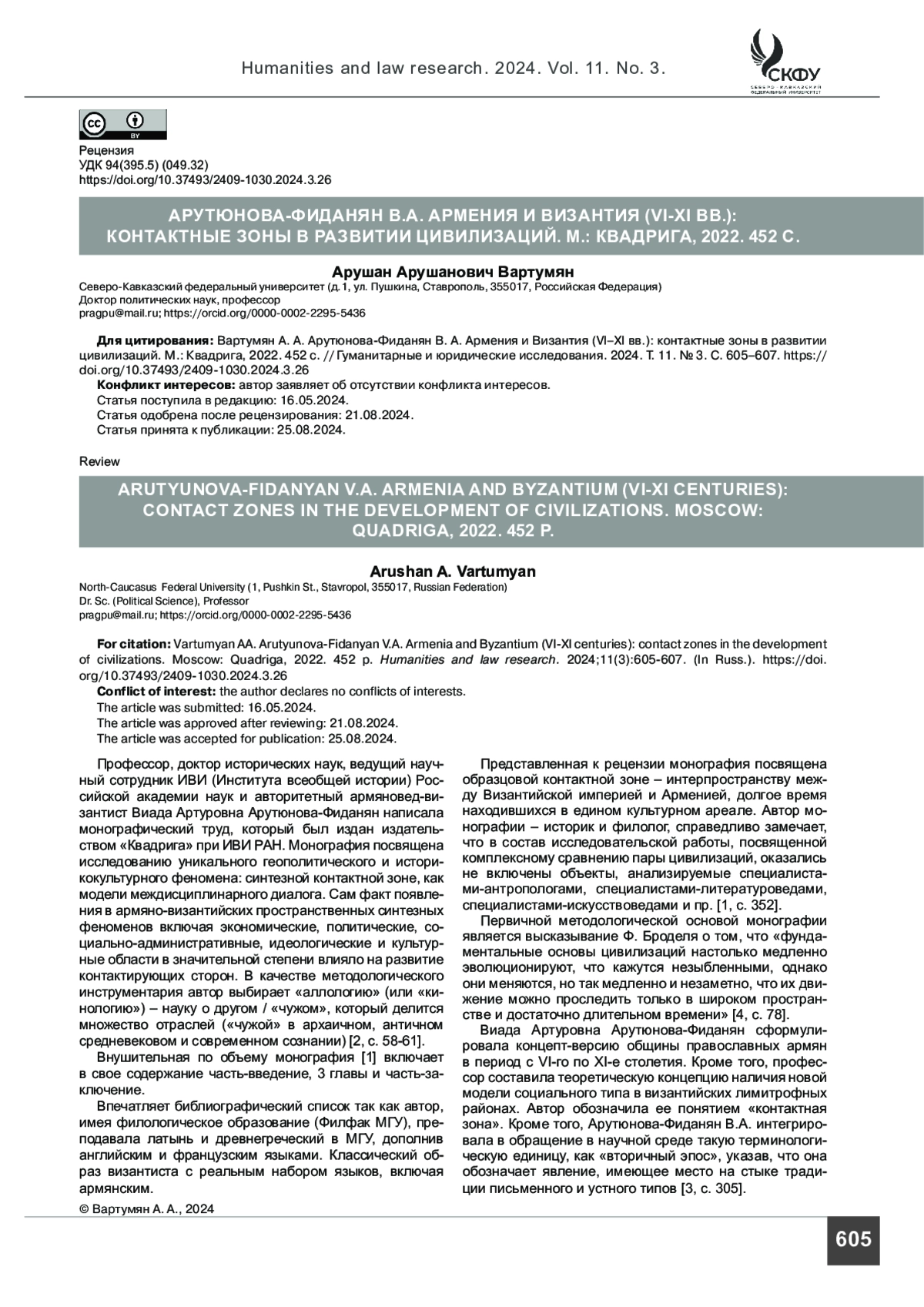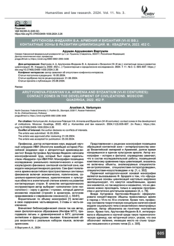 Для цитирования: Вартумян А. А. Арутюнова-Фиданян В. А. Армения и Византия (VI–XI вв.): контактные зоны в развитии цивилизаций. М.: Квадрига, 2022. 452 с. Гуманитарные и юридические исследования. 2024;11(3):605–607. https://doi. org/10.37493/2409-1030.2024.3.26