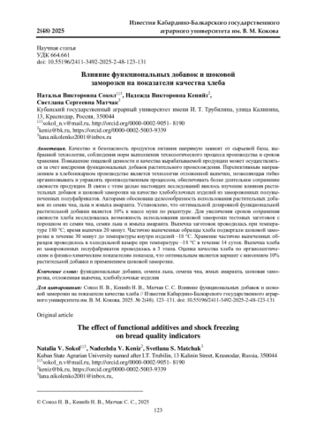 СОКОЛ Н. В., КЕНИЙЗ Н. В., МАТЧАК С. С. ВЛИЯНИЕ ФУНКЦИОНАЛЬНЫХ ДОБАВОК И ШОКОВОЙ ЗАМОРОЗКИ НА ПОКАЗАТЕЛИ КАЧЕСТВА ХЛЕБА // ИЗВЕСТИЯ КАБАРДИНО-БАЛКАРСКОГО ГОСУДАРСТВЕННОГО АГРАРНОГО УНИВЕРСИТЕТА ИМ. В. М. КОКОВА. 2025. № 2 (48)