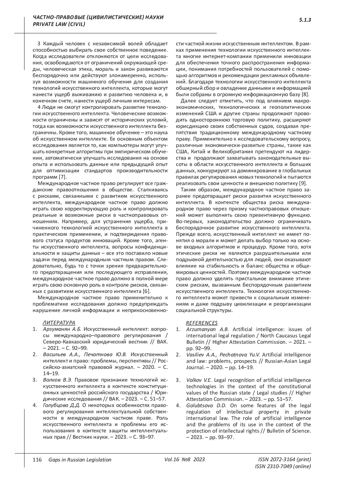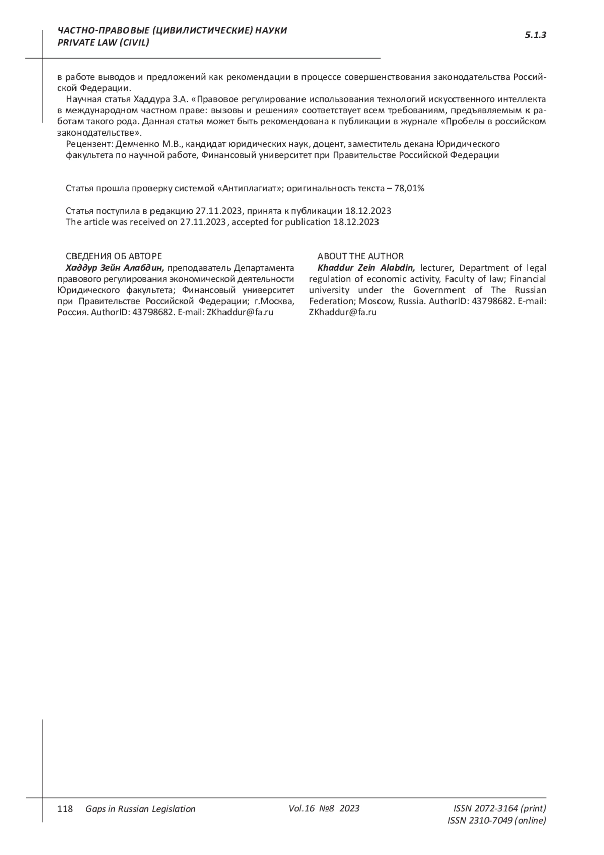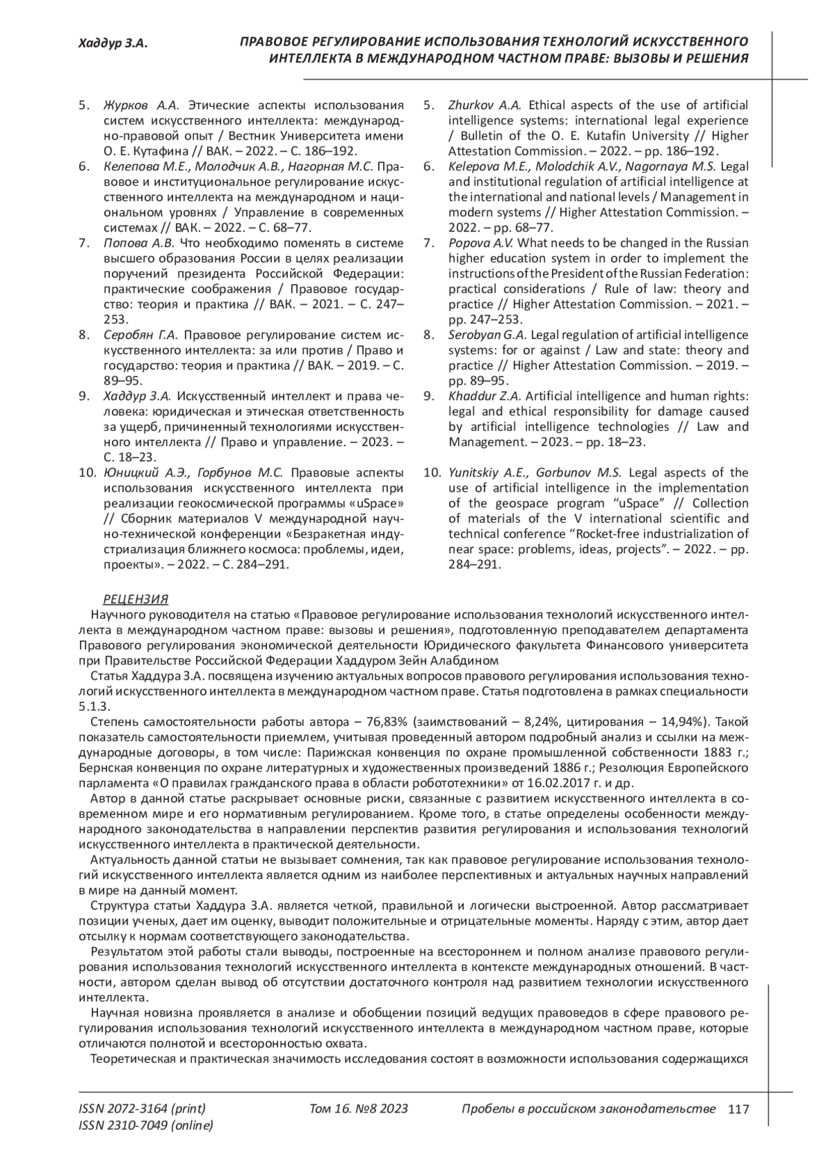 ХАДДУР З. А. ПРАВОВОЕ РЕГУЛИРОВАНИЕ ИСПОЛЬЗОВАНИЯ ТЕХНОЛОГИЙ ИСКУССТВЕННОГО ИНТЕЛЛЕКТА В МЕЖДУНАРОДНОМ ЧАСТНОМ ПРАВЕ: ВЫЗОВЫ И РЕШЕНИЯ // ПРОБЕЛЫ В РОССИЙСКОМ ЗАКОНОДАТЕЛЬСТВЕ. 2023. Т. 16 № 8 (36 СТ.)