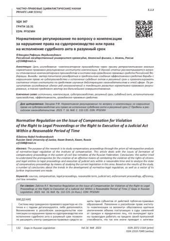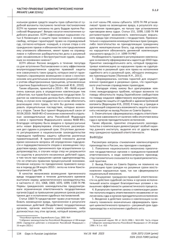 Статья: НОРМАТИВНОЕ РЕГУЛИРОВАНИЕ ПО ВОПРОСУ О КОМПЕНСАЦИИ ЗА НАРУШЕНИЕ ПРАВА НА СУДОПРОИЗВОДСТВО ИЛИ ПРАВА НА ИСПОЛНЕНИЕ СУДЕБНОГО АКТА В РАЗУМНЫЙ СРОК (2023)
