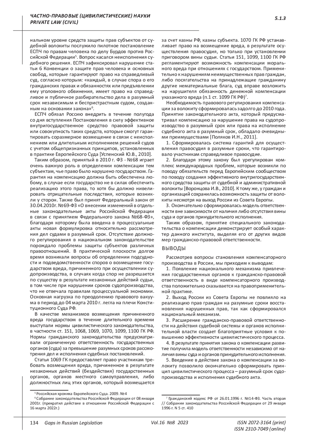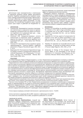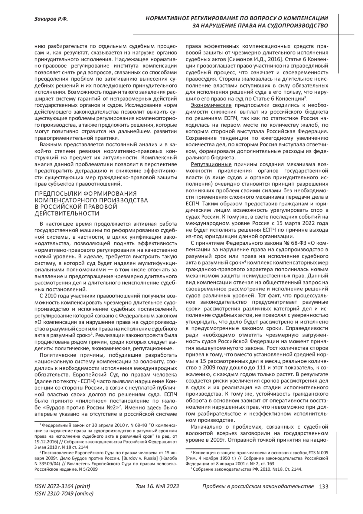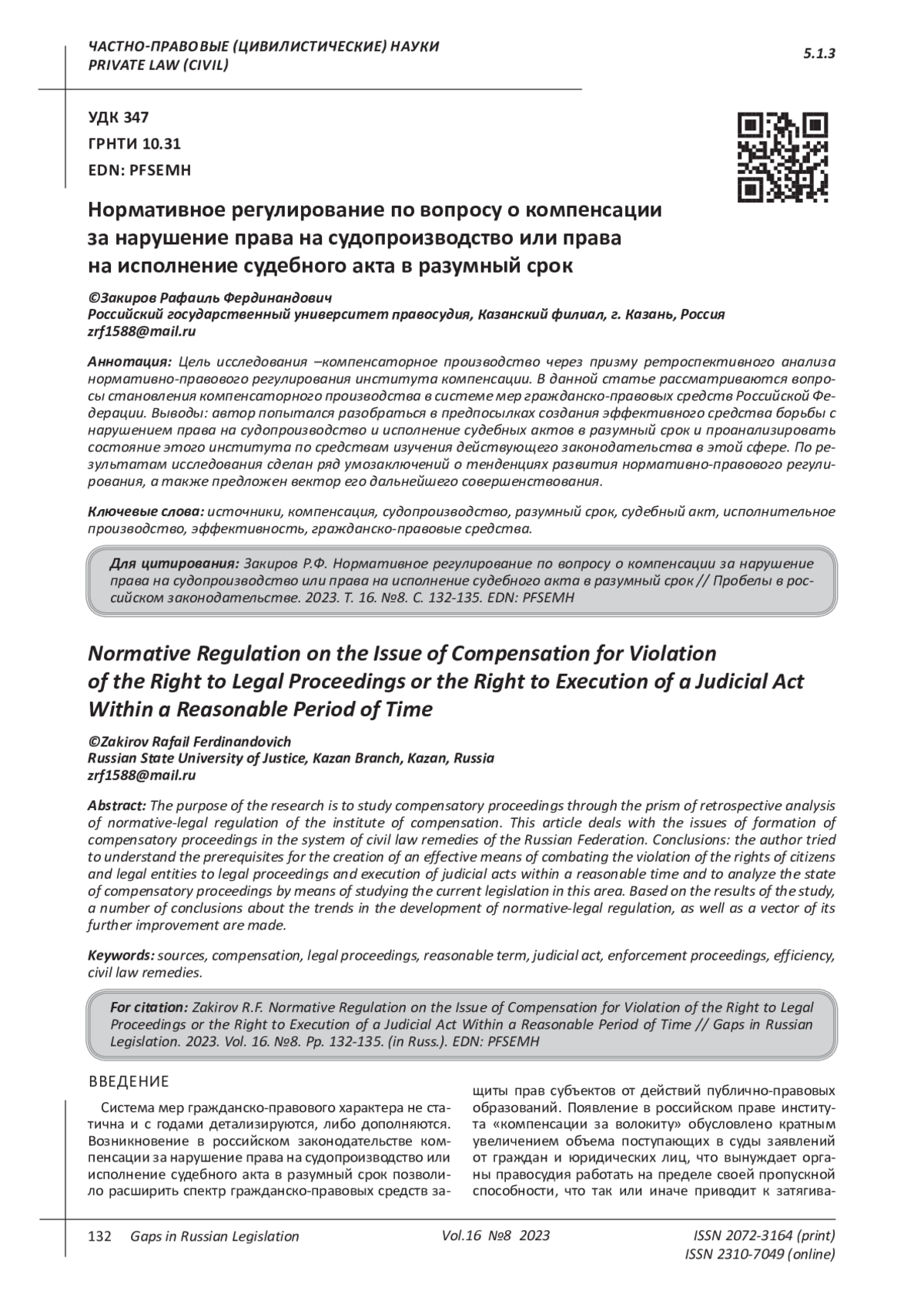 ЗАКИРОВ Р. Ф. НОРМАТИВНОЕ РЕГУЛИРОВАНИЕ ПО ВОПРОСУ О КОМПЕНСАЦИИ ЗА НАРУШЕНИЕ ПРАВА НА СУДОПРОИЗВОДСТВО ИЛИ ПРАВА НА ИСПОЛНЕНИЕ СУДЕБНОГО АКТА В РАЗУМНЫЙ СРОК // ПРОБЕЛЫ В РОССИЙСКОМ ЗАКОНОДАТЕЛЬСТВЕ. 2023. Т. 16 № 8 (36 СТ.)