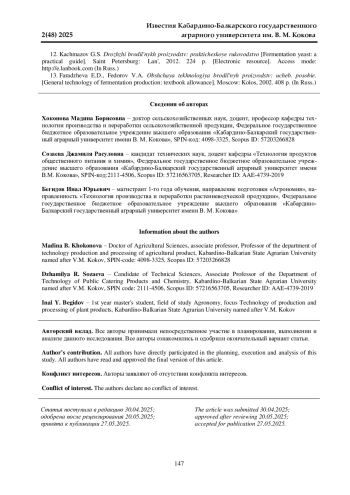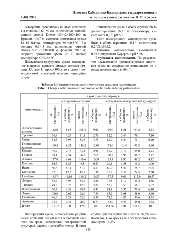 Данная работа посвящена определению изменения аминокислотного состава среды спиртового сусла, осахаренного солодом и поверхностной культурой плесени, до и после пастеризации. Исследования проводились в ООО «Премиум» и на кафедре «Технология производства и переработки сельскохозяйственной продукции» Кабардино-Балкарского ГАУ в 2023-2024 гг. В качестве объектов исследований служили осахаренное сусло до и после пастеризации, бражка, пшеничный солод, культура Aspergillus oryzae. Исследовали кукурузное сусло, осахаренное в первом варианте смесью солодов (ячмень 35, овес 35, просо 30%); во втором - поверхностной культурой плесени Aspergillus oryzae. Установлено, что пастеризация сусла, осахаренного различными агентами, сказывается в большей степени на среде, осахаренной поверхностной культурой плесени Aspergillus oryzae. В этом случае при пастеризации теряется 26,5% аминокислот, в то время как в осахаренном солодом сусле 14,2%. Тенденция к убыли наблюдается у всех шести кислот, за исключением L-лейцина, содержание которого в пастеризованном сусле, осахаренном культурой плесневого гриба, тоже несколько ниже, чем в пробе с пастеризованным суслом. Определено, что при пастеризации среды аминокислотный состав ее существенно не изменяется, однако температурному воздействию больше подвергаются аминокислоты в сусле, осахаренном поверхностной культурой плесневых грибов Aspergillus oryzae. Общее содержание аминокислот в крахмалсодержащих средах, осахаренных солодом и поверхностной культурой плесени, после пастеризации примерно одинаково и достаточно для обеспечения аминным азотом дрожжегенерацию и брожение.