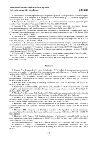 8. Хоконова М. Б., Цагоева О. К. Качественные показатели продуктов брожения в спиртовом производстве // Известия Кабардино-Балкарского государственного аграрного университета им. В. М. Кокова. 2019. № 1(23). С. 56-59. EDN: CJYQIL