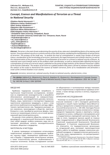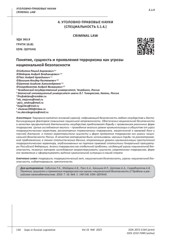 Терроризм является основной угрозой, подрывающей безопасность любого государства и дестабилизирующим фактором повышения социальной напряженности. Обеспечение национальной безопасности в качестве приоритетной деятельности государства предполагает борьбу с проявлением различных форм терроризма. Целью исследования явилось - проведение анализа уровня криминализации в обществе от угроз террористического характера, рассмотрение терминологии терроризма, закрепленной в правовой базе и научной доктрине, а также характеристика сущности и форм проявления терроризма как угрозы национальной безопасности России. В качестве материалов были использованы научные труды по рассматриваемой проблематике, а также статистические данные, отражающие уровень криминализации преступлений террористического характера, опубликованные на портале правовой статистики Генеральной прокуратуры Российской Федерации. Анализ терроризма как глобальной проблемы, создающей угрозу национальной безопасности, позволил авторам исследования охарактеризовать сущность современного терроризма, форм его проявления и сформулировать видение криминальной ситуации в нашей стране.