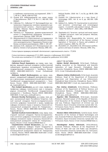 13. Сабитов Р.А., Сабитов Т.Р. Противодействие экстремизму и терроризму: уголовно-правовой и криминологический аспекты: Научно-практическое пособие. -Москва: Изд-во “Юрлитинформ”, 2023. 288 с. EDN: SRSLJK