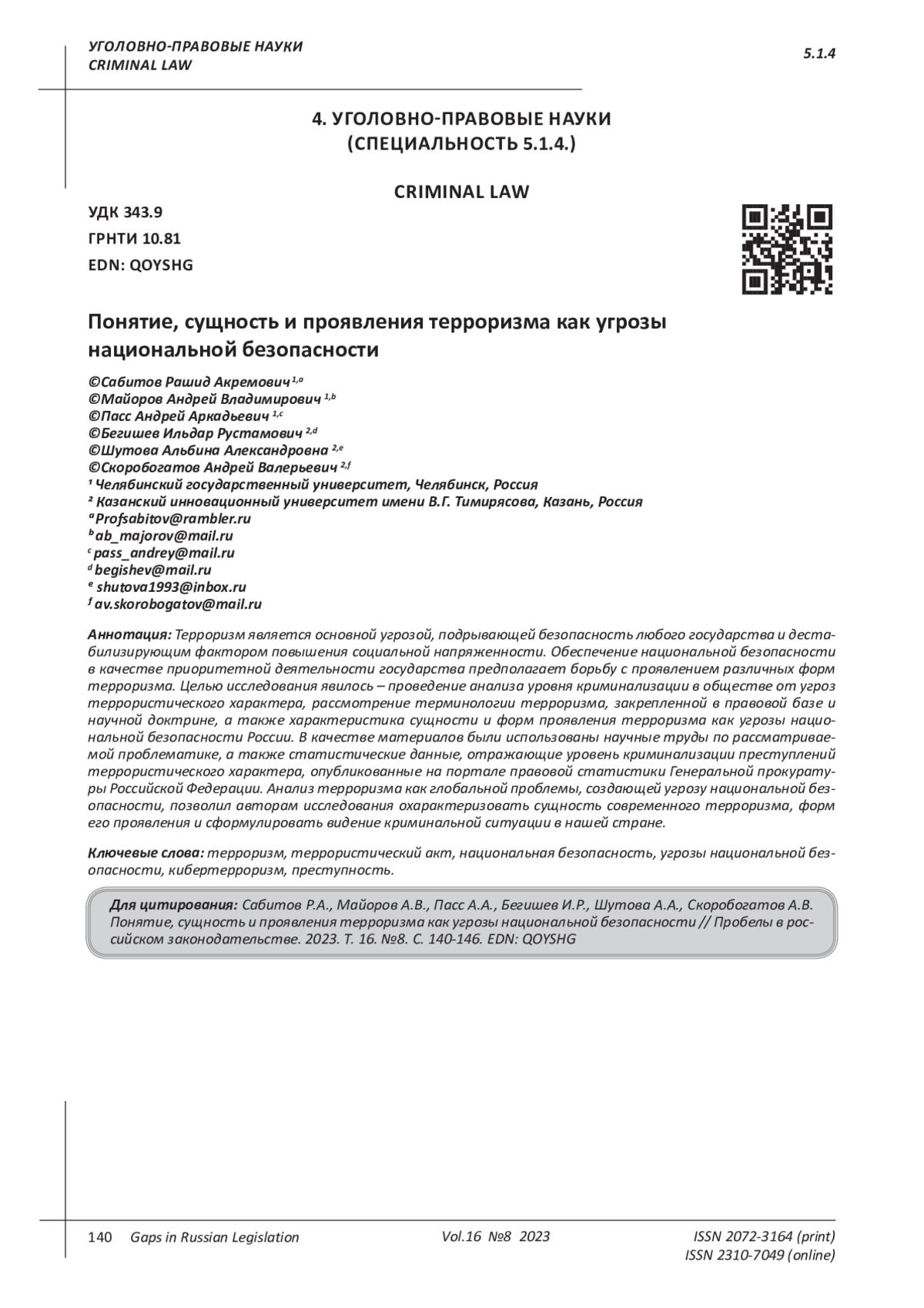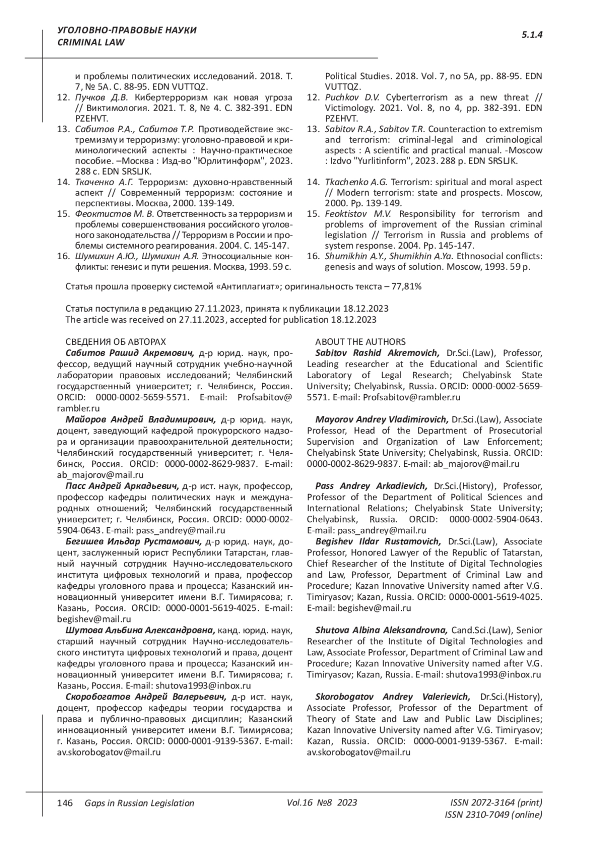 Sabitov R.A., Sabitov T.R. Counteraction to extremism and terrorism: criminal-legal and criminological aspects: A scientific and practical manual. -Moscow: Izdvo “Yurlitinform”, 2023. 288 p. EDN: SRSLJK