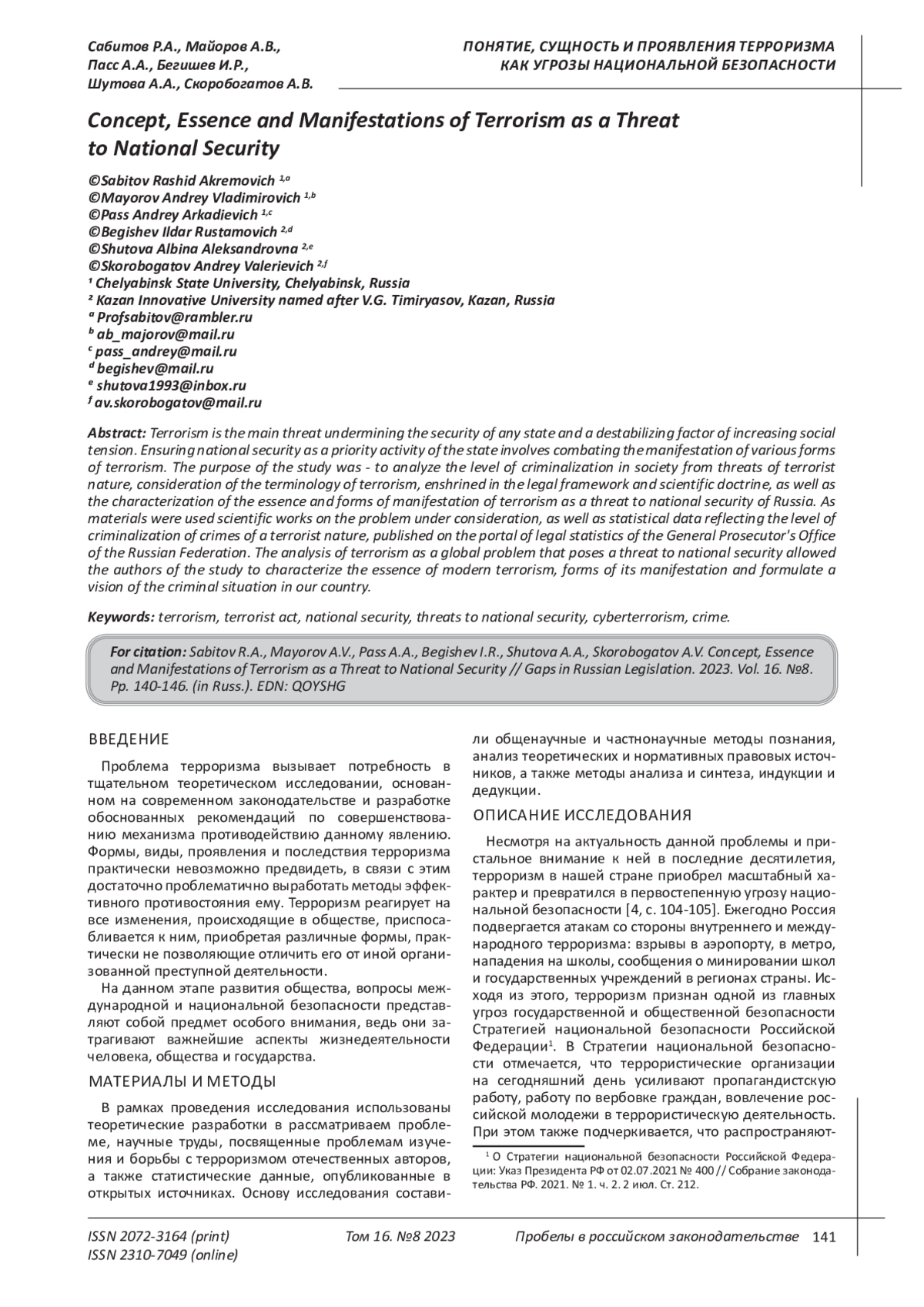 Bezverkhov A. G. “Terrorism” and “terrorist act”: criminological and legal analysis // Vestnik of Samara Humanitarian Academy. 2013, no 1, pp. 53-66. EDN: QAZZKN