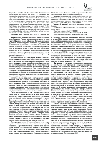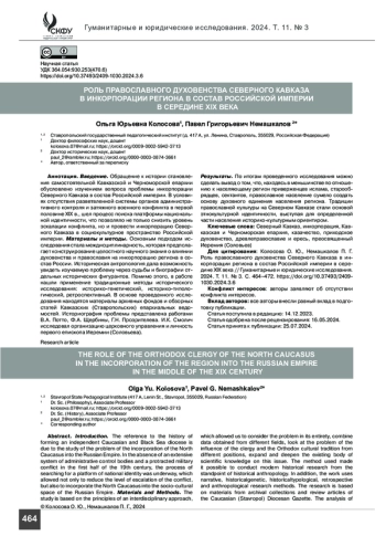 Введение. Обращение к истории становления самостоятельной Кавказской и Черноморской епархии обусловлено изучением вопроса проблемы инкорпорации Северного Кавказа в состав Российской империи. В условиях отсутствия разветвленной системы органов административного контроля и затяжного военного конфликта в первой половине XIX в., шел процесс поиска платформы национальной идентичности, что позволяло не только снизить уровень эскалации конфликта, но и провести инкорпорацию Северного Кавказа в социокультурное пространство Российской империи.