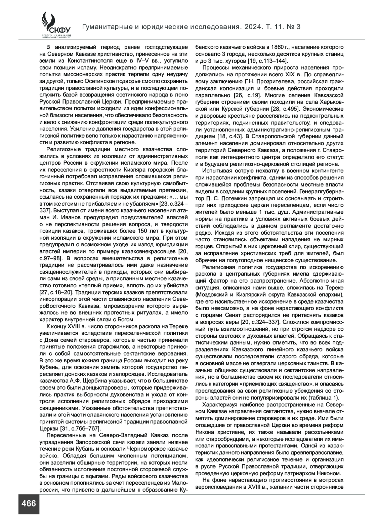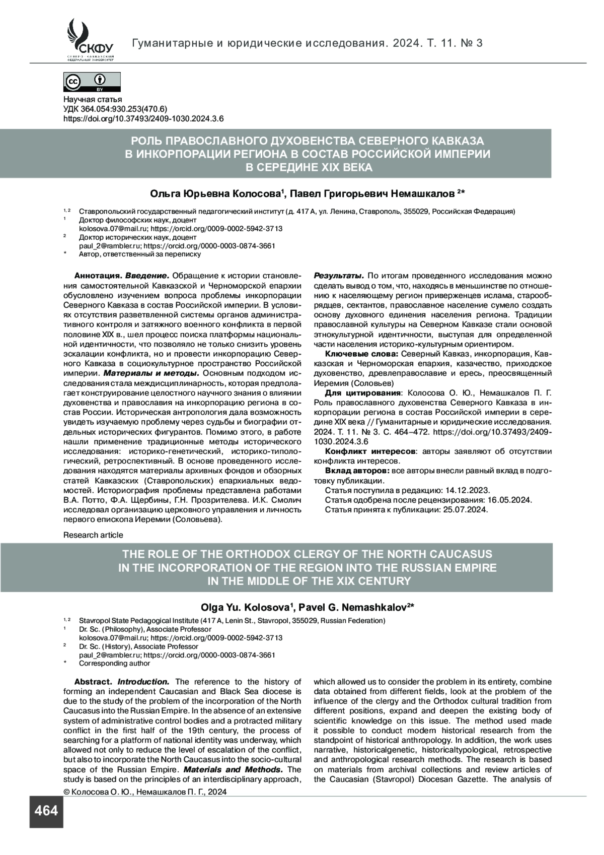 Материалы и методы. Основным подходом исследования стала междисциплинарность, которая предполагает конструирование целостного научного знания о влиянии духовенства и православия на инкорпорацию региона в состав России. Историческая антропология дала возможность увидеть изучаемую проблему через судьбы и биографии отдельных исторических фигурантов. Помимо этого, в работе нашли применение традиционные методы исторического исследования: историко-генетический, историко-типологический, ретроспективный. В основе проведенного исследования находятся материалы архивных фондов и обзорных статей Кавказских (Ставропольских) епархиальных ведомостей. Историография проблемы представлена работами В. А. Потто, Ф. А. Щербины, Г. Н. Прозрителева. И. К. Смолич исследовал организацию церковного управления и личность первого епископа Иеремии (Соловьева).