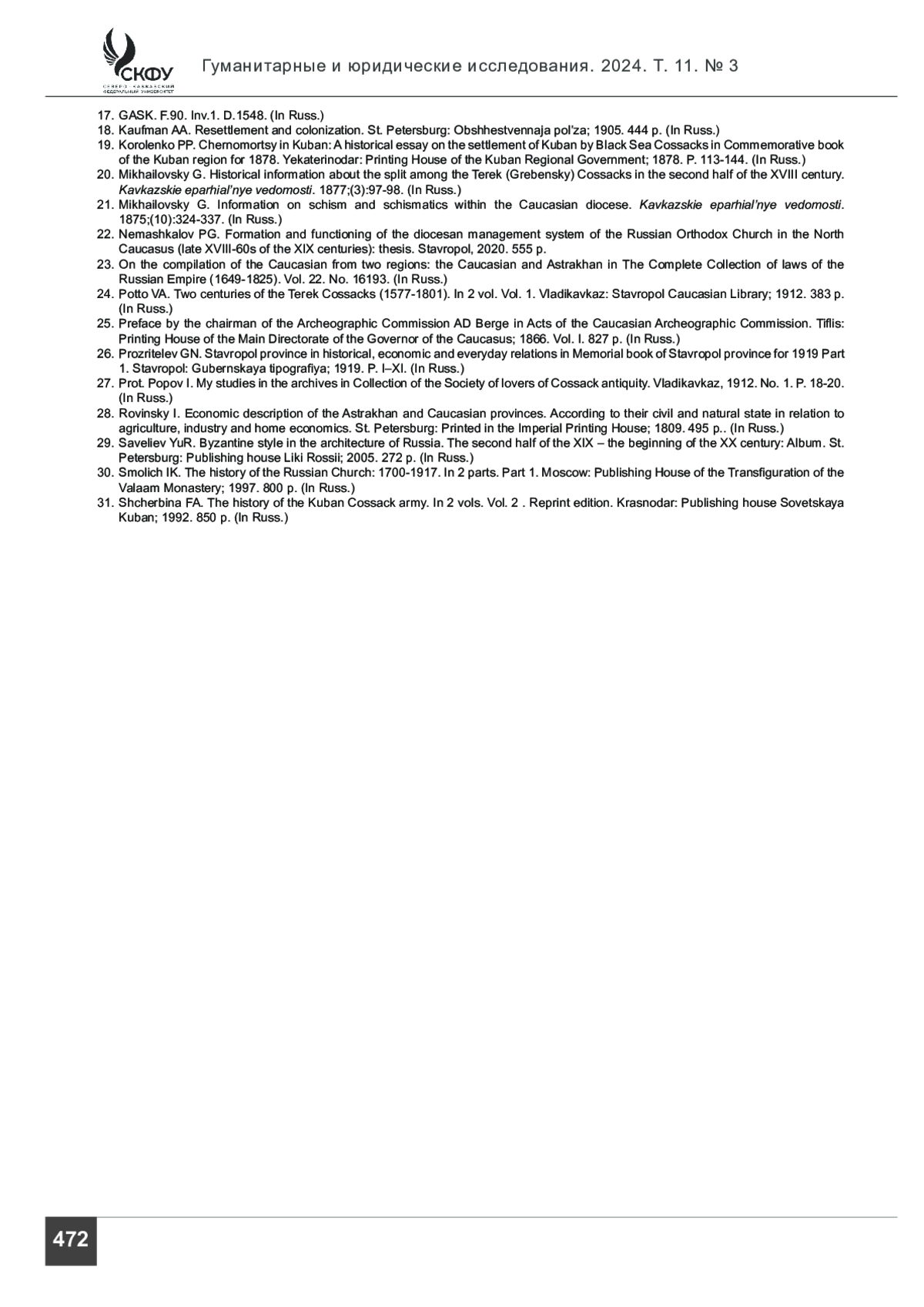 22. Немашкалов П. Г. Становление и функционирование епархиальной системы управления Русской Православной Церкви на Северном Кавказе (конец XVIII - 60е годы XIX вв.): дисс. … д-ра ист. наук: 07.00.02. Ставрополь, 2020. 555 с.