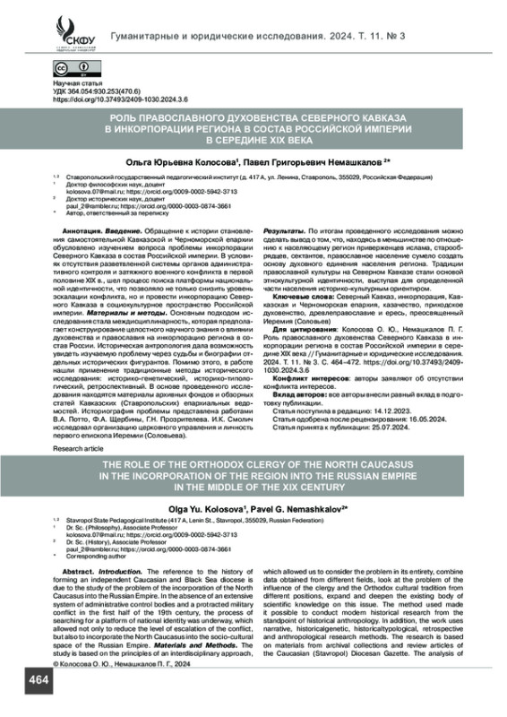 1. Володькова Е. Н., Гончаров В. Н., Колосова О. Ю., Немашкалов П. Г. Роль православного прихода в процессе инкорпорации славянского населения Северного Кавказа в социокультурное пространство Российской империи в первой половине XIX в. // Вопросы истории. 2021. № 6-2. С.152-160.