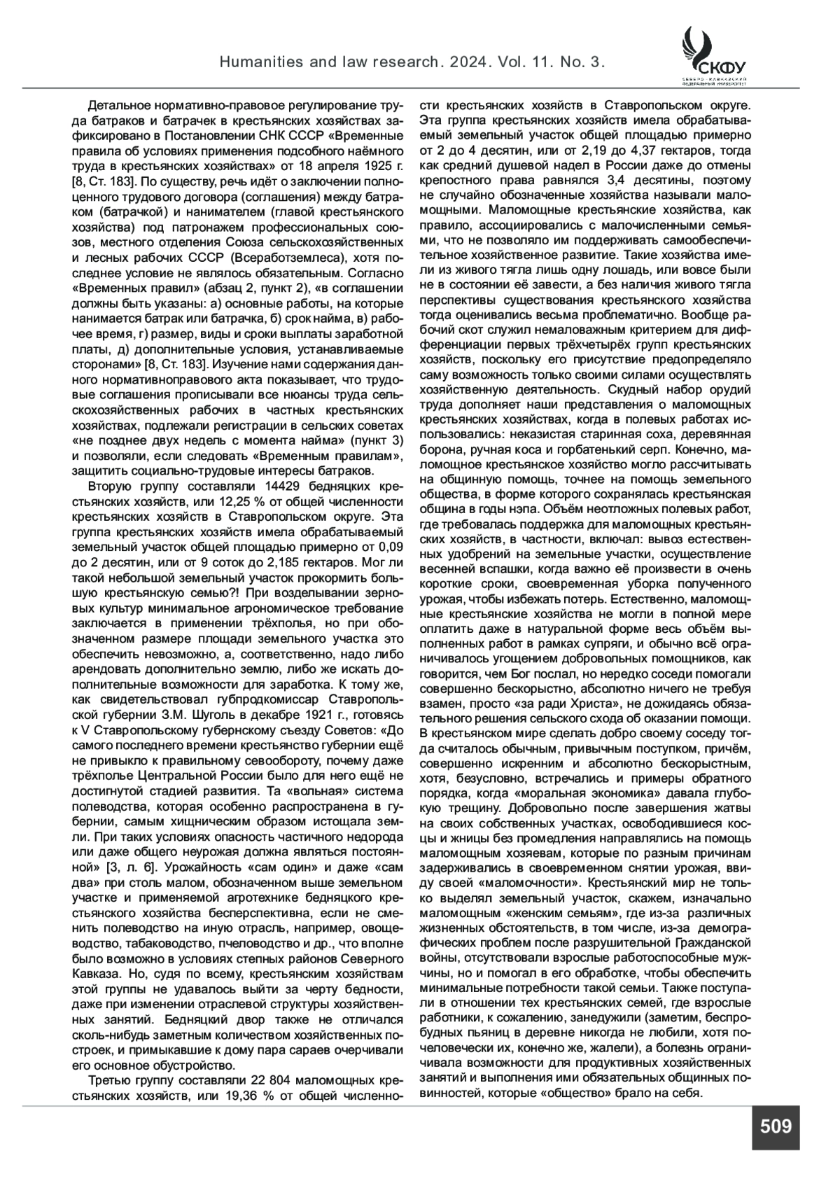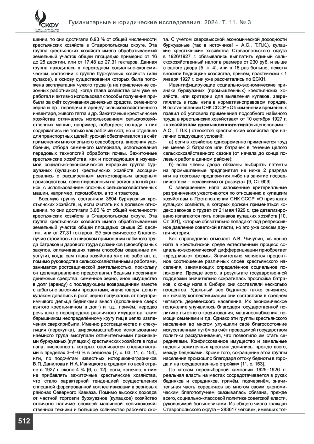 СКОРИК А. П., ПАНКОВА-КОЗОЧКИНА Т. В. СОЦИАЛЬНО-ХОЗЯЙСТВЕННАЯ ДИФФЕРЕНЦИАЦИЯ СТАВРОПОЛЬСКОЙ ДЕРЕВНИ НА ПИКЕ НЭПА // ГУМАНИТАРНЫЕ И ЮРИДИЧЕСКИЕ ИССЛЕДОВАНИЯ. 2024. ТОМ 11, № 3