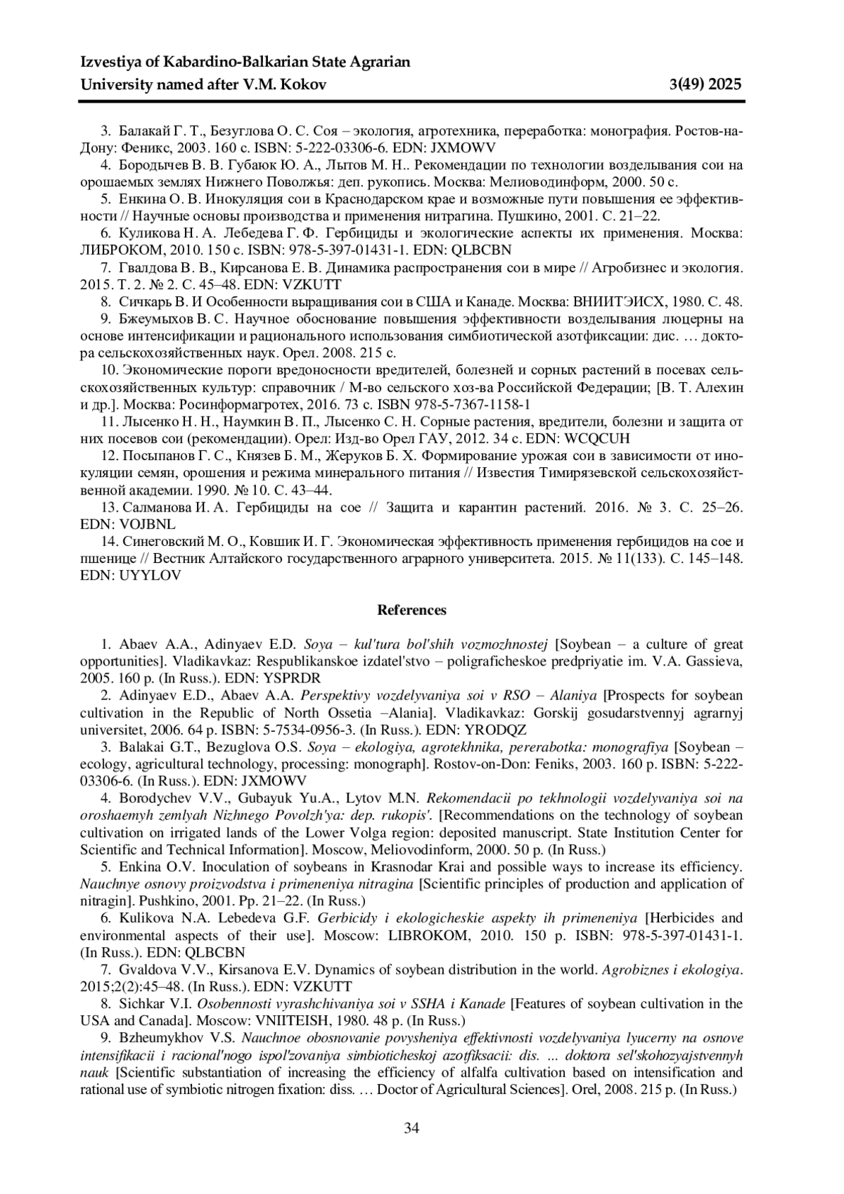12. Посыпанов Г. С., Князев Б. М., Жеруков Б. Х. Формирование урожая сои в зависимости от инокуляции семян, орошения и режима минерального питания // Известия Тимирязевской сельскохозяйственной академии. 1990. № 10. С. 43-44.