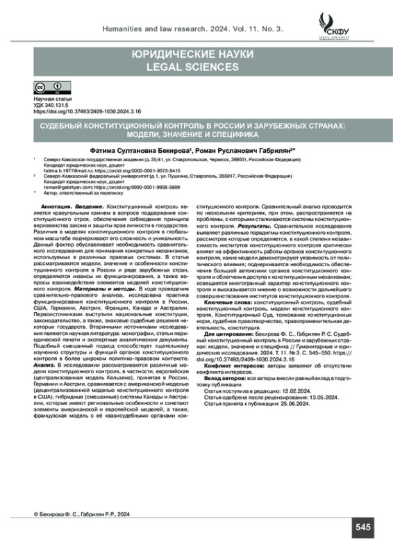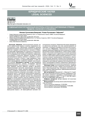 Введение. Конституционный контроль является краеугольным камнем в вопросе поддержания конституционного строя, обеспечения соблюдения принципа верховенства закона и защиты прав личности в государстве. Различия в моделях конституционного контроля в глобальном масштабе подчеркивают его сложность и уникальность. Данный фактор обуславливает необходимость сравнительного исследования для понимания конкретных механизмов, используемых в различных правовых системах. В статье рассматриваются модели, значение и особенности конституционного контроля в России и ряде зарубежных стран, определяются нюансы их функционирования, а также вопросы взаимодействия элементов моделей конституционного контроля.