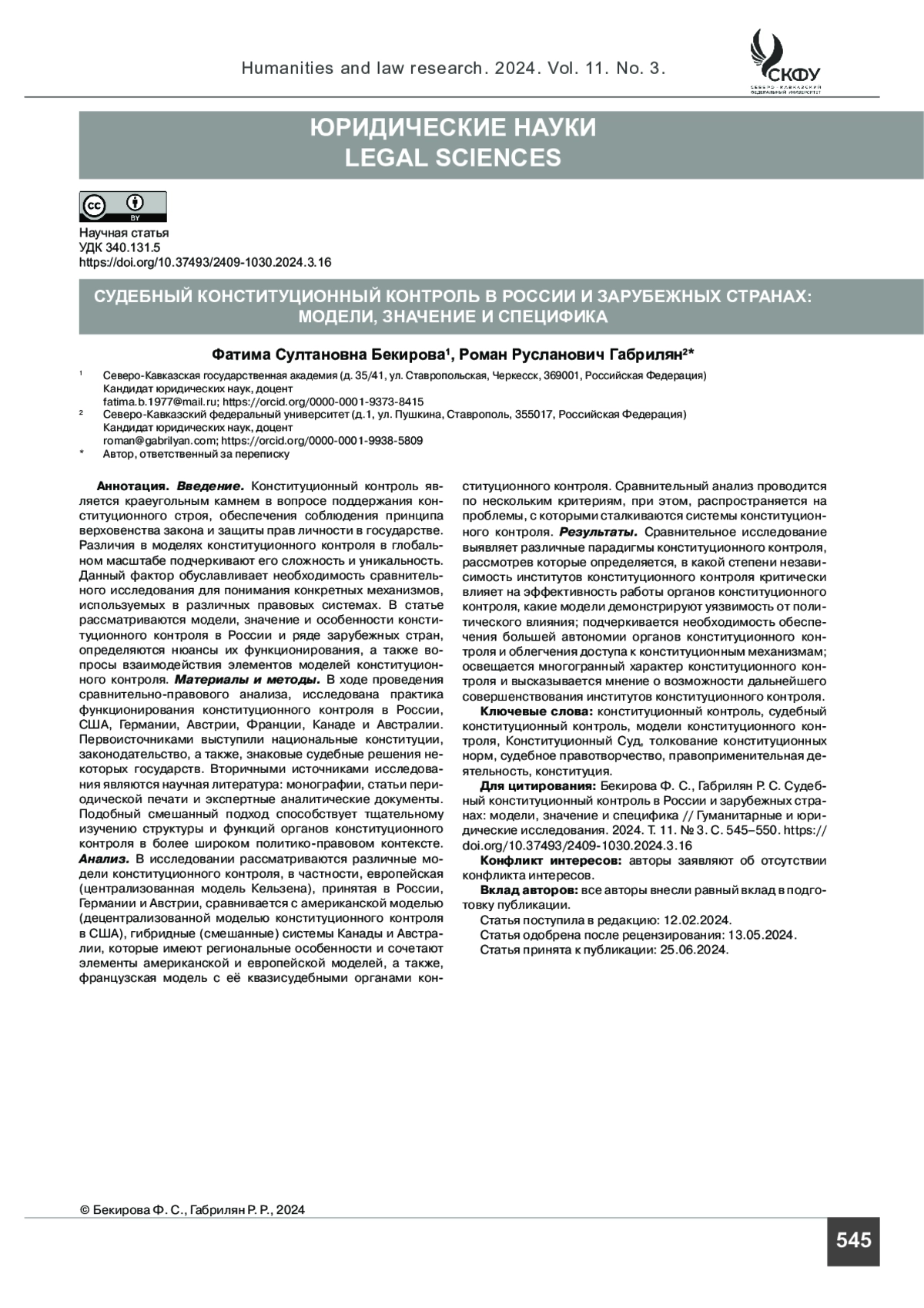 Результаты. Сравнительное исследование выявляет различные парадигмы конституционного контроля, рассмотрев которые определяется, в какой степени независимость институтов конституционного контроля критически влияет на эффективность работы органов конституционного контроля, какие модели демонстрируют уязвимость от политического влияния; подчеркивается необходимость обеспечения большей автономии органов конституционного контроля и облегчения доступа к конституционным механизмам; освещается многогранный характер конституционного контроля и высказывается мнение о возможности дальнейшего совершенствования институтов конституционного контроля.
