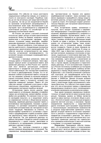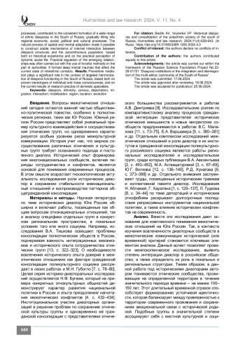 Анализ. Миграционные потоки, стимулируемые геополитическими процессами, способствовали последовательному формированию на Юге России широкого круга этнических диаспор, постепенно вписывавшихся в региональные экономические, социальные, политические и культурные процессы. Естественный процесс пространственной и ментальной адаптации позволили сконструировать устойчивые механизмы внутреннего взаимодействия диаспорных структур и автохтонного населения, опирающиеся как на исторический опыт, так и на практическое восприятие динамичной общественной жизни. Практическое регулирование складывающихся взаимоотношений нередко осуществлялось властными структурами, использовавшими силовые методы и сформировавшими глубокие ментальные травмы, влияющие и на современное состояние межэтнических контактов.