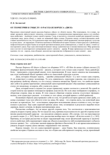 Рассказ Борхеса «El disco» («Диск») из сборника 1975 г. «El libro de arena» («Книга песка») [2] оперирует фантастическим объектом – диском, у которого есть только одна сторона. Цель данной работы – предложить структурный анализ этого произведения. В ходе такого анализа мы показываем, как столь необычный объект проявил себя в его смысловой структуре в целом.