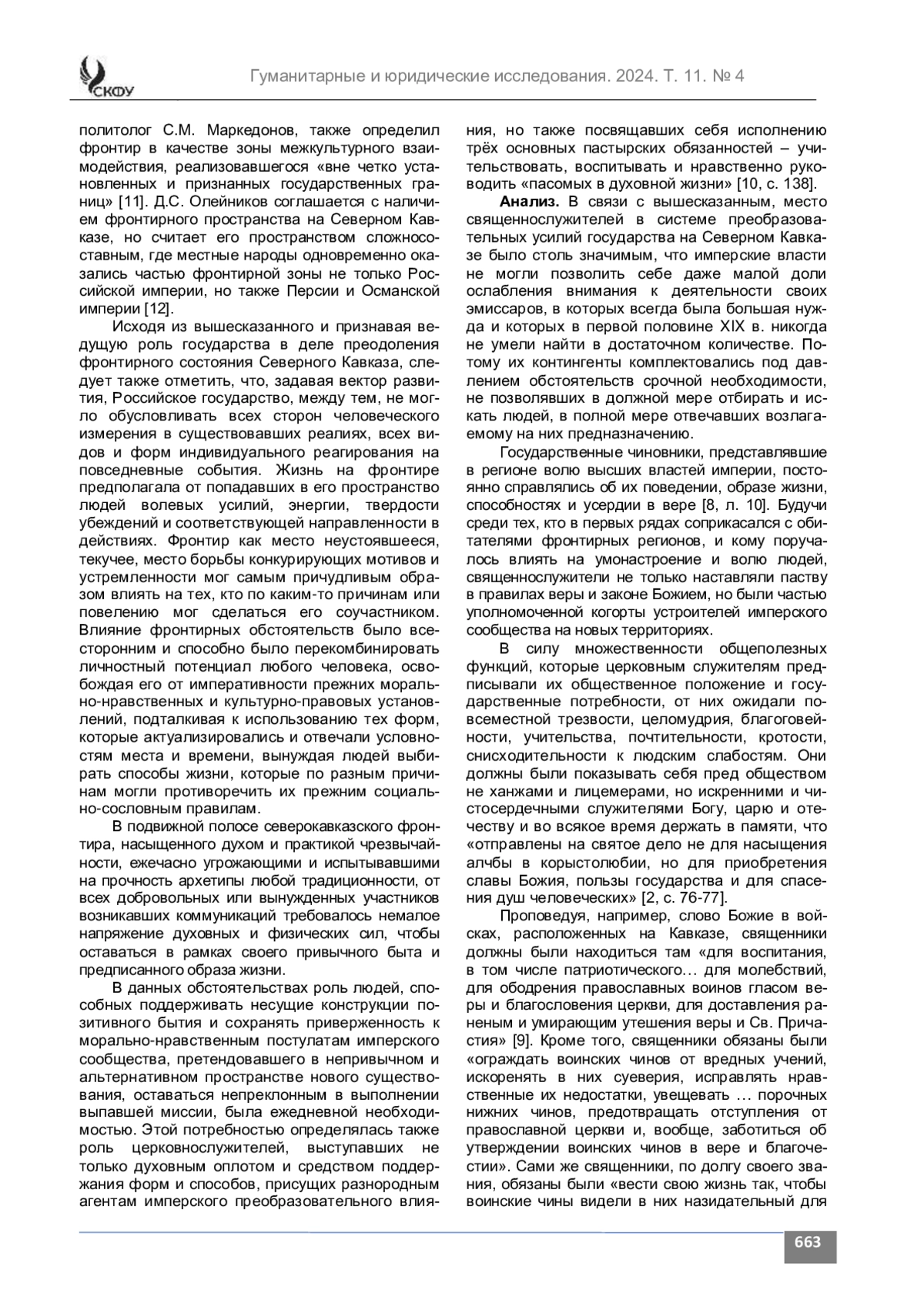 Анализ. Опираясь на представленные трактовки Т. М. Баррета, С. М. Маркедонова, Д. И. Олейникова, авторы определили сущность северокавказского фронтира как приграничной, порубежной контактной зоны межкультурного взаимодействия различных этносоциальных и этноконфессиональных групп, находившихся в конкурентных отношениях с Российским государством. Точка зрения Е. Копарева и Ф. М. Ласкеева на роль военного духовенства дала возможность выявить не только познавательный потенциал, содержащийся в их работах, но осветить и выявить общее и особенное в целеполагании предписанного священнического служения в условиях столкновения и противоборства, пропитавшего чрезвычайностью пространство Северного Кавказа в названную эпоху. Опираясь на мнение протоиерея И. Беляева, были выявлены необходимые качества человеческой натуры и её нравственных принципов, обязательных для предназначенного священнического поприща на Кавказе.