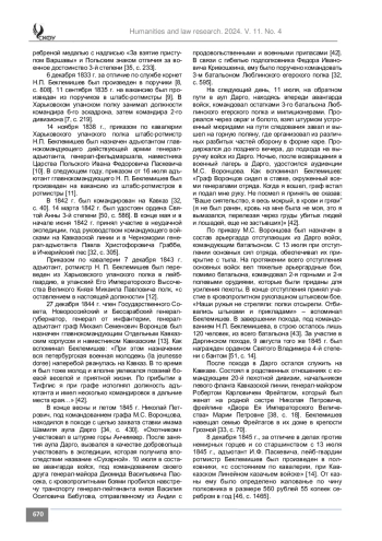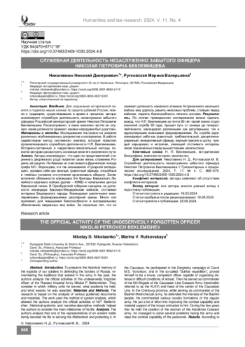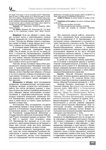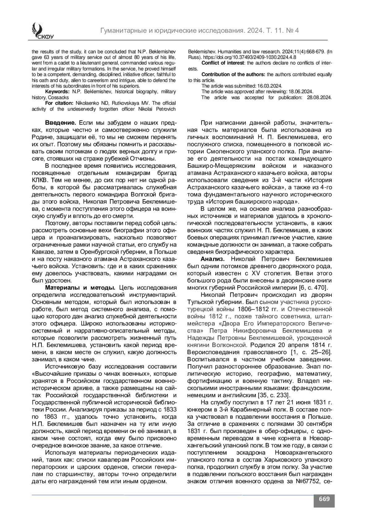 Введение. Для сохранения исторической памяти о подвигах наших воинов по защите рубежей России, помня о традициях, существовавших в армии в прошлом, авторы анализируют служебную деятельность незаслуженно забытого офицера Российской императорской армии Николая Петровича Беклемишева. Рассматривают, в каких воинских частях он служил, какие должности занимал, какими наградами был удостоен. Материалы и методы. Исследование построено на анализе различных опубликованных документов и материалов. В работе задействован метод системного анализа, который позволил проанализировать служебную деятельность Н. П. Беклемишева. Историко-системный и нарративно-описательный методы помогли авторам рассмотреть основные вехи его жизненного пути. Анализ. Авторы анализируют, что один из представителей старинного дворянского рода посвятил свою жизнь служению Родине, её защите. На Кавказе он участвовал в Даргинском походе графа М. С. Воронцова, и в так называемой «Сухарной экспедиции», проявил себя как смелый, грамотный офицер, способный в тяжёлых условиях отступления организовать оборону. Затем исполнял обязанности командира 6-й бригады Кавказского Линейного казачьего войска (далее – КЛКВ) и начальника центра Кавказской линии. В Оренбургской губернии находясь на должности командира Башкиро-Мещерякским войском, отстаивал интересы Башкирского народа. Командовал различными кавалерийскими формированиями регулярной армии. Много сил приложил для повышения боеспособности и материальному обеспечению вверенных ему войск. За несколько лет, что он занимал должность наказного атамана Астраханского казачьего войска, ему удалось решить несколько проблем, стоящих перед войском, поднять боеспособность личного состава. Результаты. По итогам проведенного исследования можно сделать вывод, что Н. П. Беклемишев из почти 80 лет своей жизни отдал воинской службе 63 года, прошел путь от юнкера до генерал-лейтенанта, командовал различными как регулярными, так и иррегулярными воинскими формированиями. По службе зарекомендовал себя как грамотный, требовательный, дисциплинированный, инициативный офицер, верный присяге и долгу, чуждый карьеризму и интригам, умеющий отстаивать интересы своих подчинённых перед вышестоящим начальством.