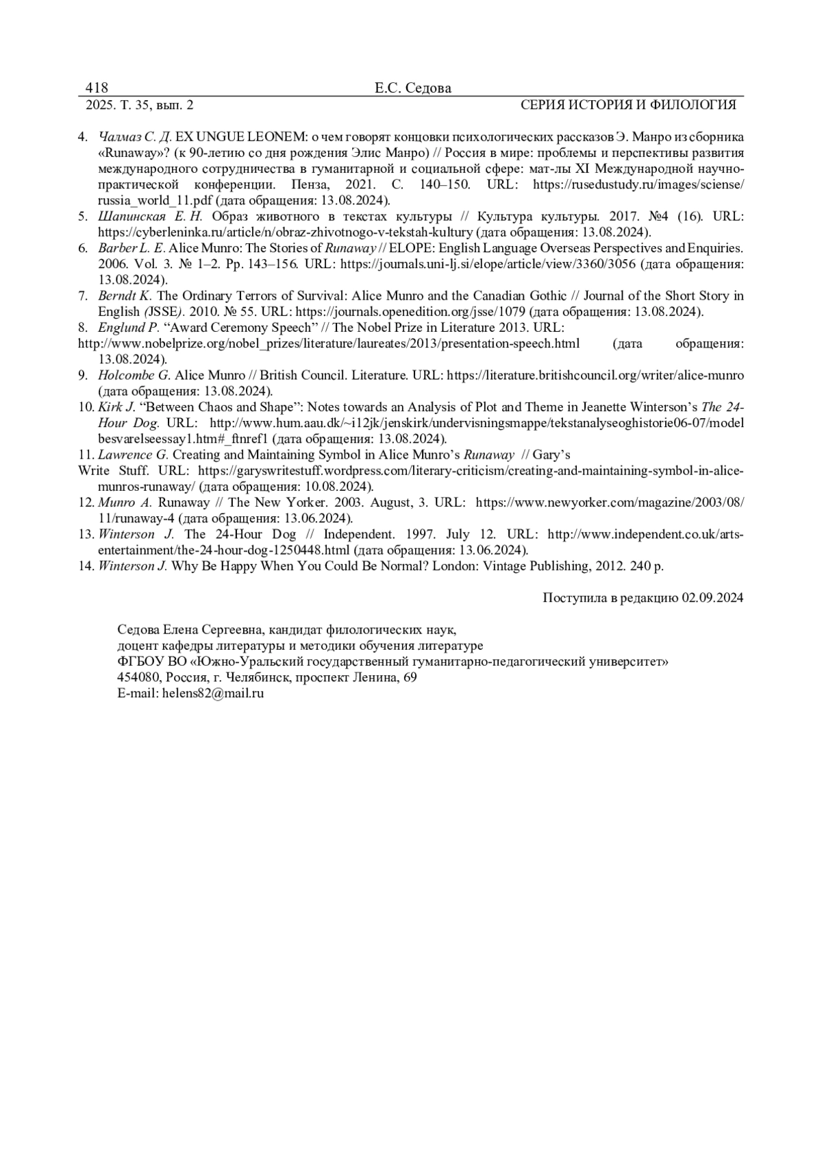 4. Чалмаз С. Д. EX UNGUE LEONEM: о чем говорят концовки психологических рассказов Э. Манро из сборника “Runaway”? (к 90-летию со дня рождения Элис Манро) // Россия в мире: проблемы и перспективы развития международного сотрудничества в гуманитарной и социальной сфере: мат-лы XI Международной научно-практической конференции. Пенза, 2021. С. 140-150. URL: https://rusedustudy.ru/images/sciense/russia_world_11.pdf (дата обращения: 13.08.2024).