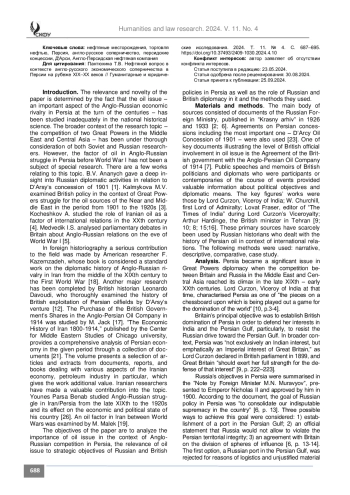 Введение. Актуальность и новизна работы определяется отсутствием в отечественной литературе специального исследования такого важного аспекта англо-русского экономического соперничества в Персии на рубеже XIX–XX вв., как нефтяной вопрос.