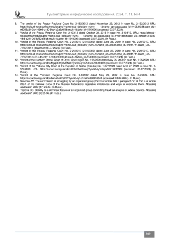 8. Приговор Ростовской областного суда № 2-152/2012 от 29 ноября 2012 г. по делу № № 2-152/2012. URL: https://oblsud--ros.sudrf.ru/modules.php?name=sud_delo&srv_num=1&name_op=case&case_id=44052402&case_uid=e6053d24-2fc4-4966-b180-9be4b2a9c6f5&result=1&delo_id=1540006 (дата обращения: 03.07.2024).