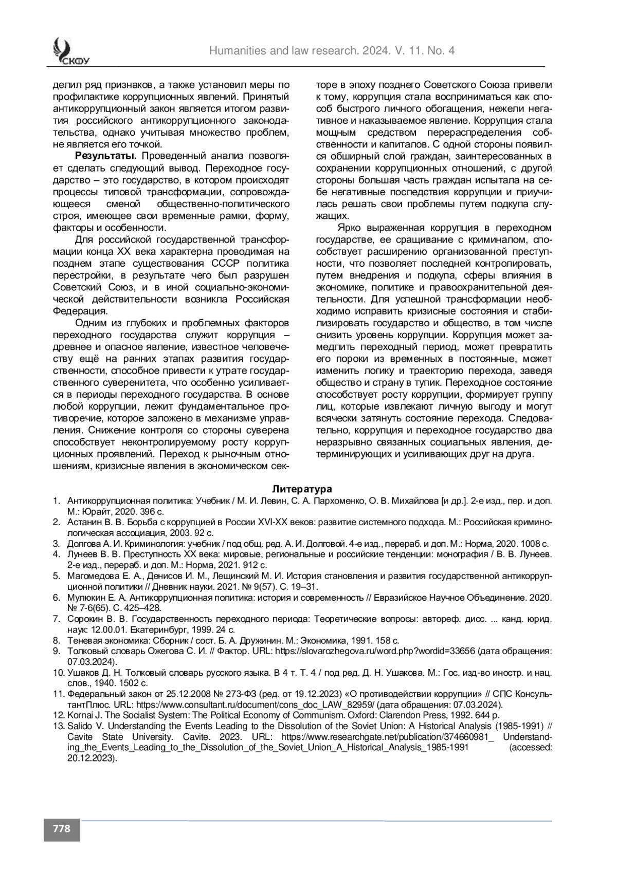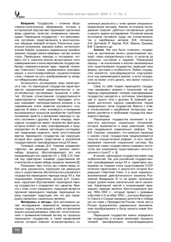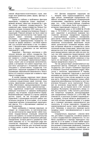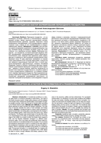 Результаты. В статье делается вывод о том, что коррупция и переходное государство – два неразрывно связанных социальных явления, детерминирующих и усиливающих друг на друга.
