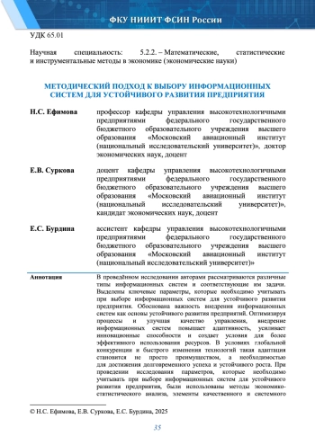В проведённом исследовании авторами рассматриваются различные типы информационных систем и соответствующие им задачи. Выделены ключевые параметры, которые необходимо учитывать при выборе информационных систем для устойчивого развития предприятия. Обоснована важность внедрения информационных систем как основы устойчивого развития предприятий. Оптимизируя процессы и улучшая качество управления, внедрение информационных систем повышает адаптивность, усиливает инновационные способности и создает условия для более эффективного использования ресурсов. В условиях глобальной конкуренции и быстрого изменения технологий такая адаптация становится не просто преимуществом, а необходимостью для достижения долговременного успеха и устойчивого роста. При проведении исследования параметров, которые необходимо учитывать при выборе информационных систем для устойчивого развития предприятия, были использованы методы экономико-статистического анализа, элементы качественного и системного анализов, позволяющие оценить полученные результаты комплексно. Выбор информационных систем для устойчивого развития предприятия является критически важным процессом, от которого зависит эффективность и адаптивность организации в условиях быстро меняющейся бизнес-среды. При проведении исследования авторы выделили основные параметры, которые следует учитывать при выборе информационных систем.