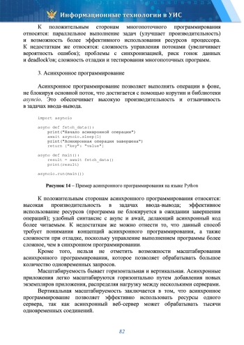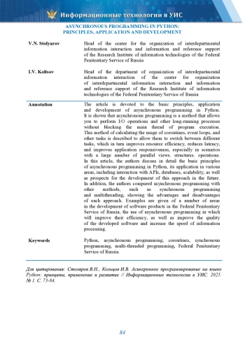 СТОЛЯРОВ В. Н., КОЛЬЦОВ И. В. АСИНХРОННОЕ ПРОГРАММИРОВАНИЕ НА ЯЗЫКЕ PYTHON: ПРИНЦИПЫ, ПРИМЕНЕНИЕ И РАЗВИТИЕ // ИНФОРМАЦИОННЫЕ ТЕХНОЛОГИИ В УИС. 2025. № 1