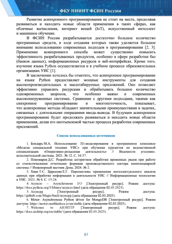 Статья посвящена основным принципам, применению и развитию асинхронного программирования на языке Python. Показано, что асинхронное программирование - это способ, позволяющий выполнять операции ввода-вывода и другие длительные процессы без блокировки основного потока выполнения программы. Описано, что указанный способ достигается за счет использования корутин, событийных циклов и других механизмов, позволяющих программе переключаться между разными задачами, что, в свою очередь, повышает эффективность использования ресурсов, снижает время ожидания и улучшает отзывчивость приложений, особенно в сценариях, связанных с большим количеством параллельных операций. В данной статье авторами подробно рассматриваются основные принципы асинхронного программирования на языке Python, его применение в различных сферах, включая взаимодействие с API, базами данных, возможности масштабируемости, а также перспективы развития данного подхода в будущем. Проведено сравнение асинхронного программирования с другими способами, такими, как синхронное программирование и многопоточность, показаны преимущества и недостатки каждого подхода. Приведены примеры ряда направлений разработки программных продуктов в ФСИН России, применение асинхронного программирования в которых позволит улучшить их эффективность, а также повысит качество разработанных программных средств и увеличит скорость обработки информации.