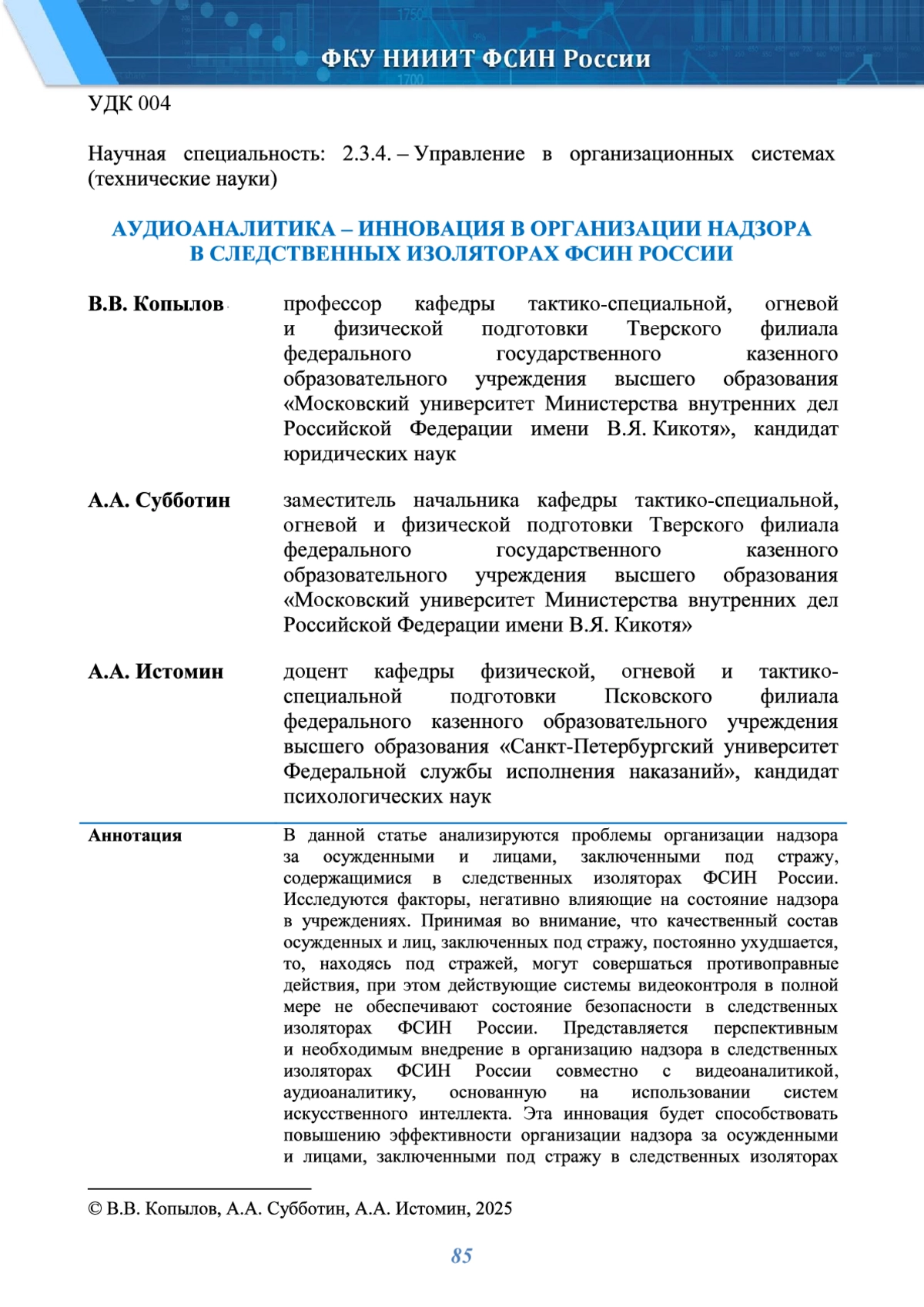 В данной статье анализируются проблемы организации надзора за осужденными и лицами, заключенными под стражу, содержащимися в следственных изоляторах ФСИН России. Исследуются факторы, негативно влияющие на состояние надзора в учреждениях. Принимая во внимание, что качественный состав осужденных и лиц, заключенных под стражу, постоянно ухудшается, то, находясь под стражей, могут совершаться противоправные действия, при этом действующие системы видеоконтроля в полной мере не обеспечивают состояние безопасности в следственных изоляторах ФСИН России. Представляется перспективным и необходимым внедрение в организацию надзора в следственных изоляторах ФСИН России совместно с видеоаналитикой, аудиоаналитику, основанную на использовании систем искусственного интеллекта. Эта инновация будет способствовать повышению эффективности организации надзора за осужденными и лицами, заключенными под стражу в следственных изоляторах ФСИН России. Внедрение в систему надзора следственных изоляторов ФСИН России аудиоаналитики, оснащенной технологиями искусственного интеллекта, даст возможность обеспечить автоматизированную обработку фактически всей голосовой и аудиовизуальной информации, поступающей от микрофонных и телефонных технических средств. Современная технологичная аудиоаналитика обеспечит анализ и контроль речевого поведения осужденных и лиц, заключенных под стражу, перевод разговоров и анализ их содержания, а также возможность анализировать звуки, происходящие в камере и на их основе получать максимально полную информацию о латентных процессах. Внедрение современной аудиоаналитики может быть положено в основу создания отечественной системы кибернадзора за осужденными и лицами, заключенными под стражу, содержащимися в следственных изоляторах ФСИН России и существенным образом повысить состояние безопасности сотрудников, осужденных и лиц, заключенных под стражу и других граждан.