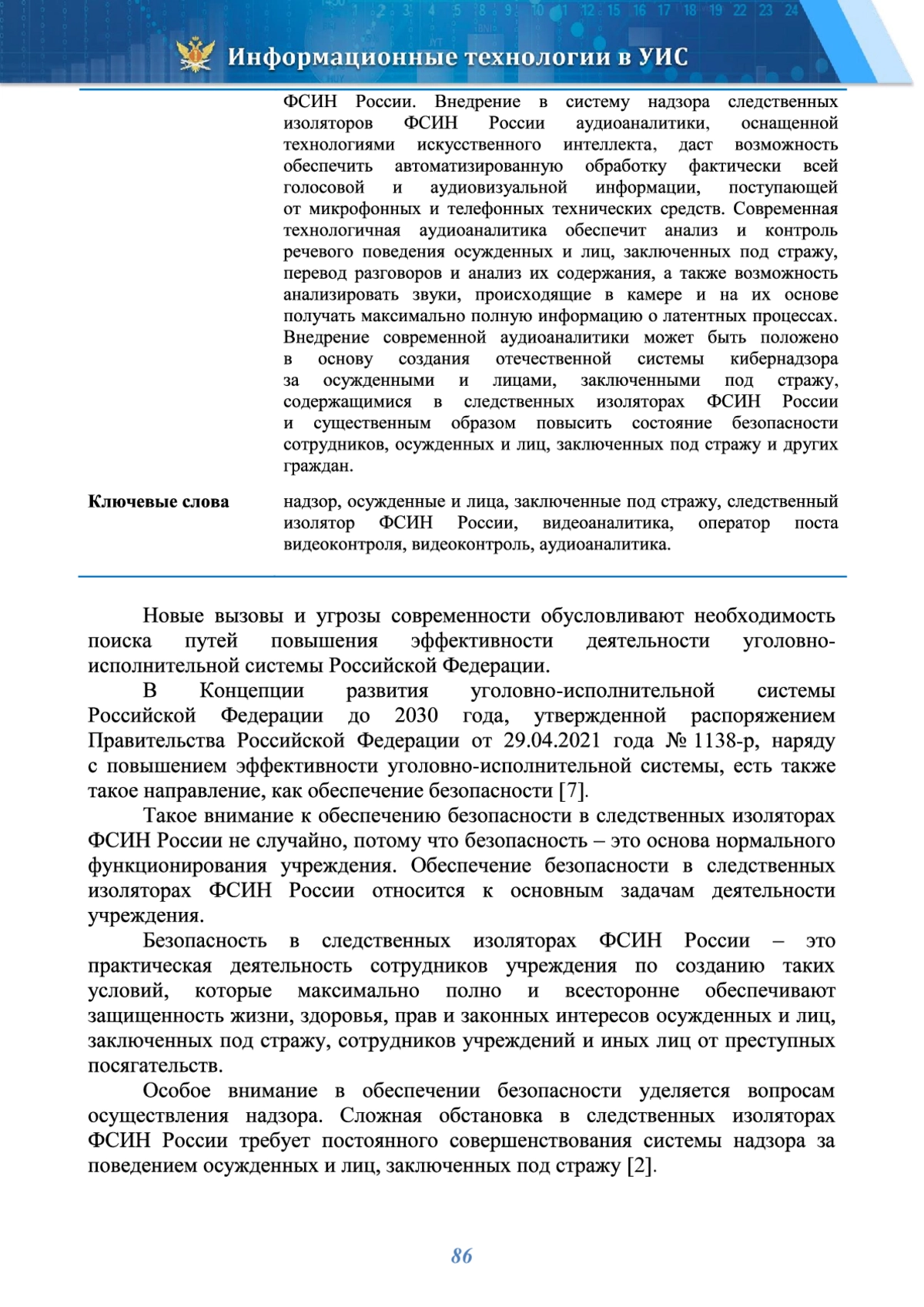 Новые вызовы и угрозы современности обусловливают необходимость поиска путей повышения эффективности деятельности уголовно- исполнительной системы Российской Федерации. системы В Концепции развития уголовно-исполнительной Российской Федерации до 2030 года, утвержденной распоряжением Правительства Российской Федерации от 29.04.2021 года No 1138-р, наряду с повышением эффективности уголовно-исполнительной системы, есть также такое направление, как обеспечение безопасности [7].