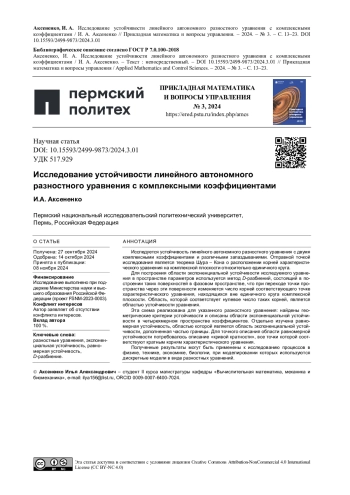 АКСЕНЕНКО И. А. ИССЛЕДОВАНИЕ УСТОЙЧИВОСТИ ЛИНЕЙНОГО АВТОНОМНОГО РАЗНОСТНОГО УРАВНЕНИЯ С КОМПЛЕКСНЫМИ КОЭФФИЦИЕНТАМИ // ПРИКЛАДНАЯ МАТЕМАТИКА И ВОПРОСЫ УПРАВЛЕНИЯ. 2024. № 3