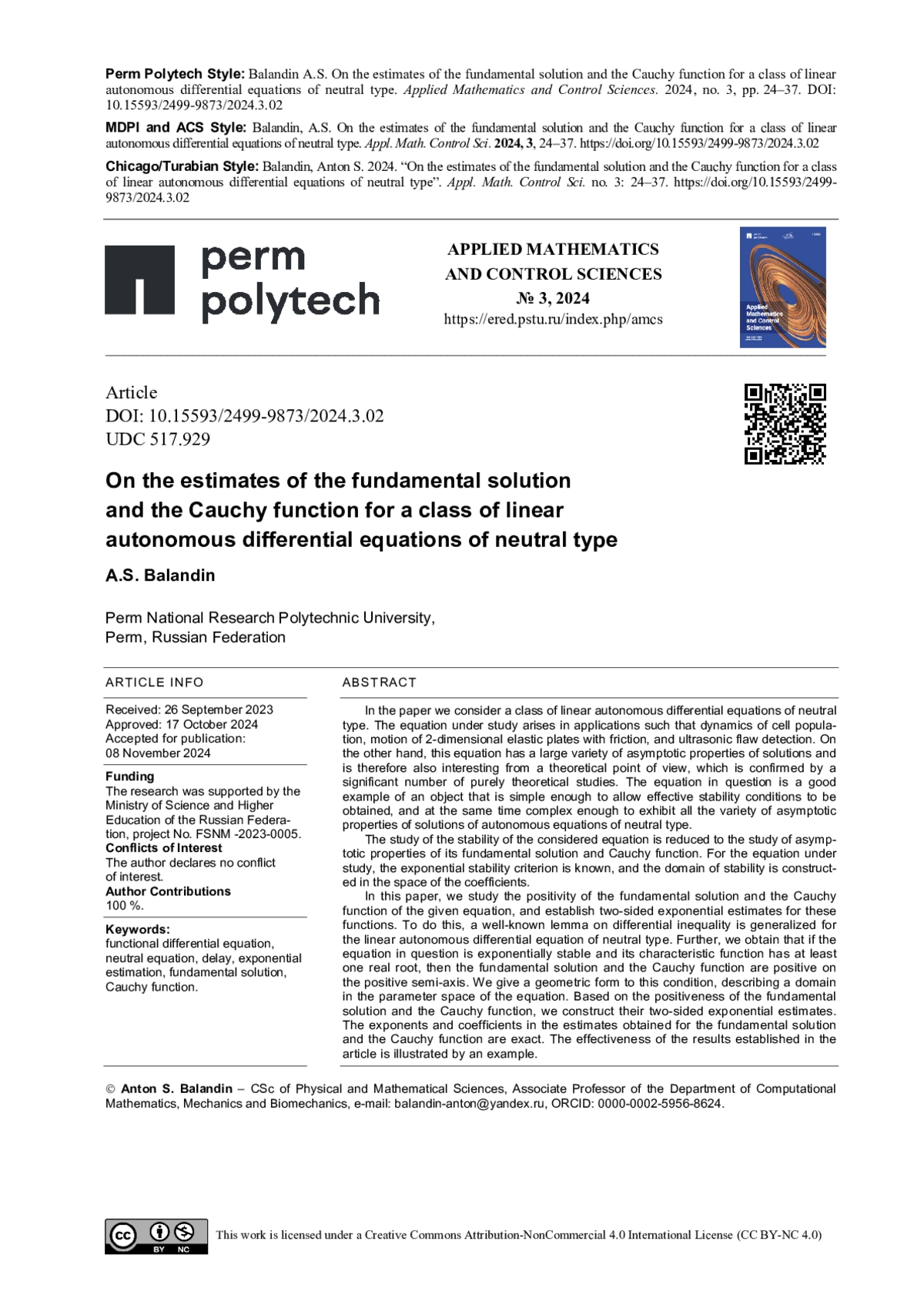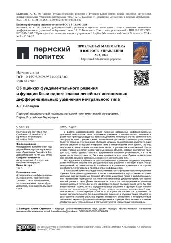 11. Баландин, А. С. О связи между фундаментальным решением и функцией Коши для функционально-дифференциальных уравнений нейтрального типа / А. С. Баландин // Прикладная математика и вопросы управления. - 2018. - № 1. - С. 13-25. EDN: XMTBTV