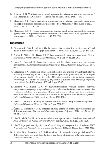 15. Малыгина, В. В. Оценка показателя экспоненты для устойчивых решений одного класса дифференциально-разностных уравнений / В. В. Малыгина // Изв. вузов. Матем. - 2021. - № 12. - С. 67-79. EDN: JBJEFV