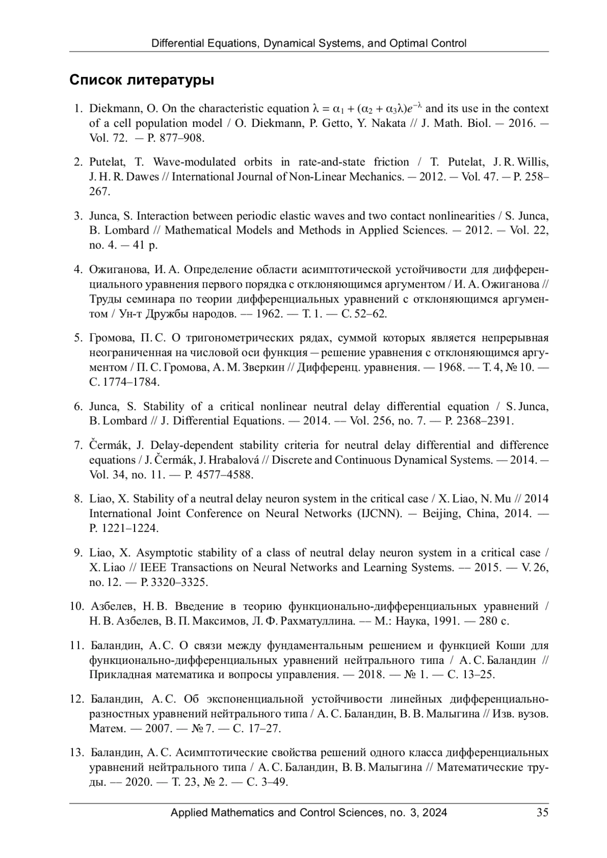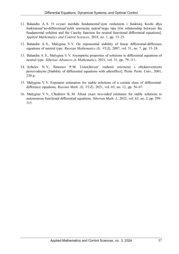12. Баландин, А. С. Об экспоненциальной устойчивости линейных дифференциально- разностных уравнений нейтрального типа / А. С. Баландин, В. В. Малыгина // Изв. вузов. Матем. - 2007. - № 7. - С. 17-27. EDN: JKEEUH