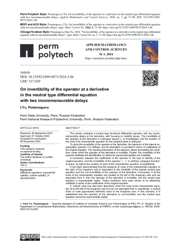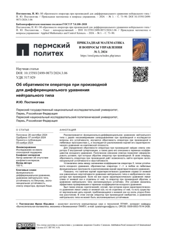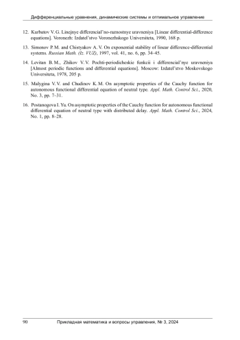 16. 	Постаногова, И. Ю. Об асимптотических свойствах функции Коши автономного функционально-дифференциального уравнения нейтрального типа с распределённым запаздыванием / И. Ю. Постаногова // Прикладная математика и вопросы управления. - 2024. - № 1. - С. 8-28.  EDN: DNTPIC