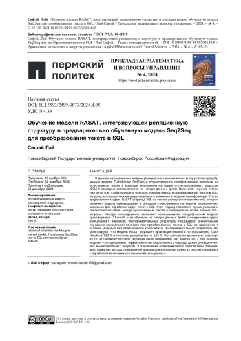 В данном исследовании модуль реляционного внимания интегрируется в предобученную модель Transformer Seq2Seq и осуществляется преобразование вопросов на естественном языке в команды извлечения на языке структурированных запросов (SQL) с помощью экспериментов на наборе данных Spider. Цель этой научной статьи состоит в том, чтобы улучшить точность и эффективность преобразования текста в SQLзапросы, используя механизм реляционного внимания в модели трансформера. Статья представляет модель RASAT (переход SQL на основе реляционного внимания), которая заменяет модуль самовращения в энкодере трансформера на модуль реляционного внимания для обработки задач текст-к-SQL. Этот подход позволяет лучше учитывать семантические связи между сущностями в тексте и генерировать более точные SQLзапросы. Методы исследования включают использование предобученной модели трансформера (T5-small) и ее обучение на наборе данных Spider с введением модуля реляционного внимания. Экспериментальные результаты показывают значительное улучшение показателей точности при преобразовании текста в SQL по сравнению с базовой моделью без реляционного компонента. Экспериментальные результаты демонстрируют, что модель RASAT улучшает производительность по показателю Exact Match на 1,82 % и точность выполнения на 3,26 %. Эти улучшения достигнуты несмотря на то, что количество эпох обучения было ограничено 500 вместо 3072 для базовой модели, что подчеркивает эффективность предложенного подхода даже при ограниченных вычислительных ресурсах. В заключение подчеркиваются перспективы дальнейшего развития метода реляционной модели для улучшения качества систем, связанных с обработкой естественного языка и базами данных.