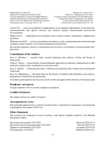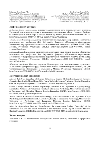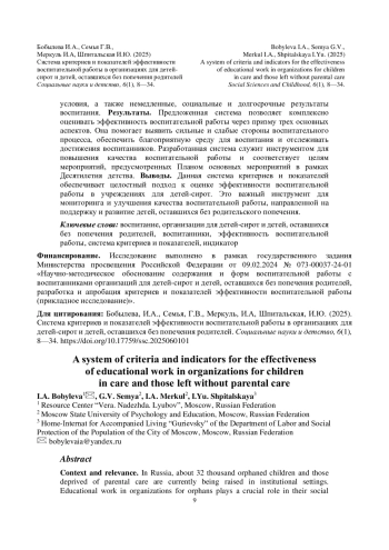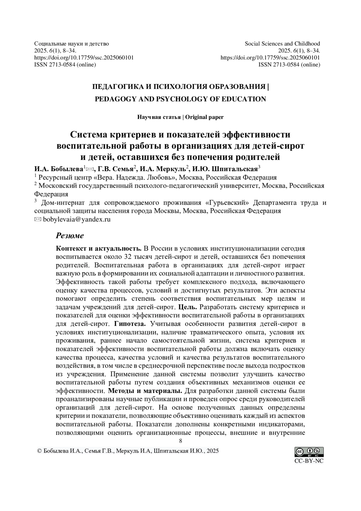Bobyleva, I.A., Semya, G.V. (2024). The specifics of educational work in organizations for orphaned children and children left without parental care. Social Sciences and Childhood, 5(3), 40-53. (In Russ.). DOI: 10.17759/ssc.2024050303