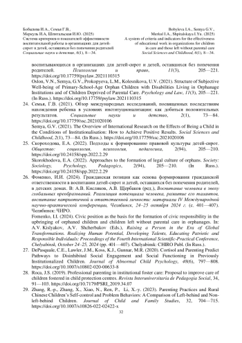 24. Семья, Г.В. (2021). Обзор международных исследований, посвященных последствиям нахождения ребенка в условиях институционализации: как добиться положительных результатов. Социальные науки и детство, 2(1), 73-84. DOI: 10.17759/ssc.2021020106