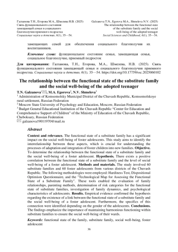 Контекст и актуальность. Функциональное состояние замещающей семьи оказывает значительное влияние на социальное благополучие приемного подростка. Исследование направлено на выявление взаимосвязи между этими аспектами, что важно для понимания процессов адаптации и интеграции приемных детей в новые семьи. Цель. Выявить связь между функциональным состоянием замещающей семьи и социальным благополучием приемного подростка. Гипотеза. Существует положительная корреляция между функциональным состоянием замещающей семьи и уровнем социального благополучия приемного подростка. Методы и материалы. В исследовании приняли участие 60 замещающих семей и 60 приемных детей подросткового возраста из различных районов Чувашской Республики. Использовались следующие методики: Опросник «Моя семья», Тест жизнестойкости, Опросник диспозиционного оптимизма, Опросник СОРЕ и «Технологическая карта оценки функционального состояния замещающей семьи». Эти инструменты позволили оценить взаимоотношения в семьях, методы воспитания, определить категорию риска функционального состояния замещающей семьи, исследовать семейные отношения и психологические характеристики подростков. Результаты. Эмпирическим путем была подтверждена гипотеза о существовании связи между функциональным состоянием замещающей семьи и социальным благополучием приемного подростка. Кроме того, были выявлены особенности этой связи в зависимости от пола подростков. Выводы. Результаты подчеркивают значимость поддержания гармоничного функционирования замещающих семей для обеспечения социального благополучия их воспитанников.