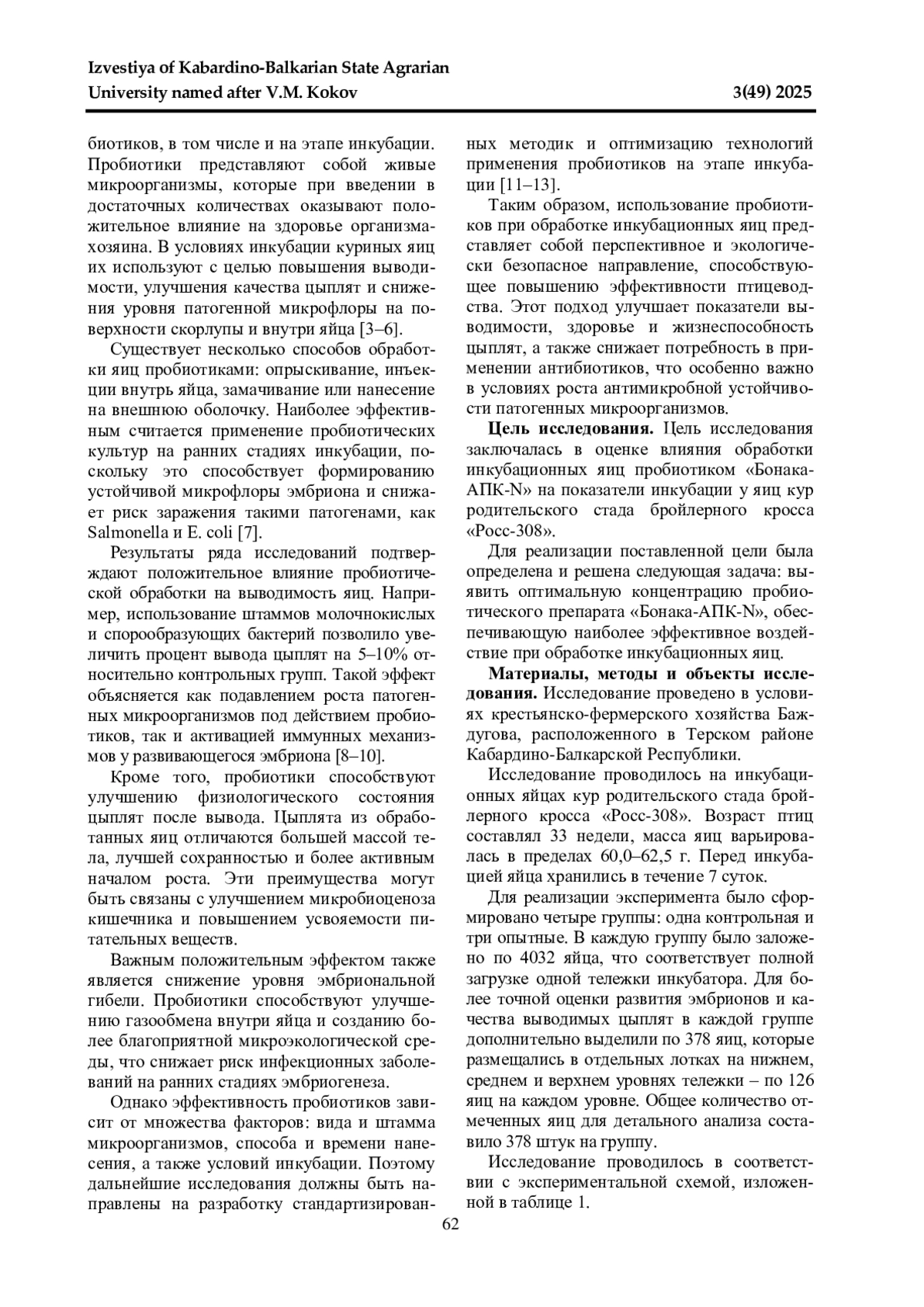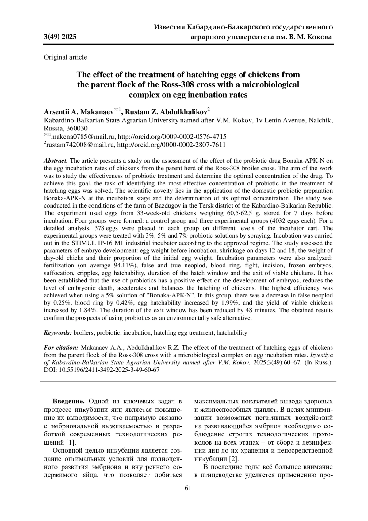 В статье исследована оценка влияния пробиотического препарата «Бонака-АПК-N» на показатели инкубации яиц кур родительского стада бройлерного кросса «Росс-308». Цель и задачи - изучение эффективности пробиотической обработки инкубационных яиц и определение оптимальной концентрации препарата. Научная новизна заключается в применении отечественного пробиотического препарата «Бонака-АПК-N» на этапе инкубации и в определении его оптимальной концентрации. Исследование проводилось в условиях КФХ Баждугова, Терский район, Кабардино-Балкарская Республика. В опыте использовались яйца от 33-недельных кур массой 60,5-62,5 г, хранившиеся 7 суток до инкубации. Было сформировано 4 группы: контрольная и три опытные (по 4032 яйца в каждой). Для детального анализа в каждой группе было отобрано по 378 яиц, размещённых на разных уровнях тележки инкубатора. Обработка опытных групп проводилась 3, 5 и 7% растворами пробиотика методом опрыскивания. Инкубация осуществлялась в промышленном инкубаторе СТИМУЛ ИП-16 М1 по утвержденному режиму. В ходе исследования оценивались показатели развития эмбрионов: масса яиц до инкубации, усушка на 12 и 18 сутки, масса суточных цыплят в сравнении с начальной массой яйца. Также анализировались параметры инкубации: оплодотворённость (в среднем 94,11%), ложный и истинный неоплод, кровяное кольцо, бой, насечка, замершие эмбрионы, задохлики, калеки, выводимость яиц, продолжительность выводного окна и выход жизнеспособных цыплят. Установлено, что применение пробиотиков положительно влияет на развитие эмбрионов, снижает уровень эмбриональной гибели, ускоряет и уравнивает вывод цыплят. Наибольшая эффективность достигнута при использовании 5% раствора «Бонака-АПК-N». В этой группе наблюдалось снижение ложного неоплода на 0,25%, кровяного кольца - на 0,42%. Выводимость яиц повысилась на 1,99%, а выход жизнеспособных цыплят - на 1,84%. Продолжительность выводного окна сократилась на 48 минут. Полученные результаты подтверждают перспективность использования пробиотиков как экологически безопасной альтернативы.