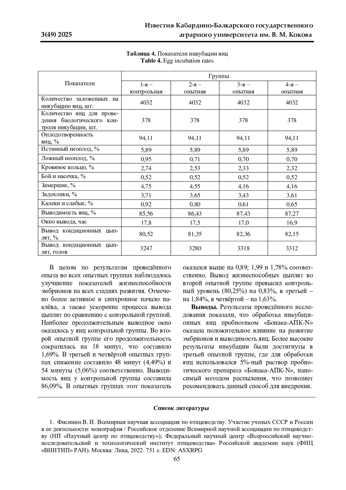 6. 	Лыско С. Б., Задорожная М. В. Эффективное средство для обработки инкубационных яиц // Птицеводство. 2018. № 8. С. 52-55. EDN: YNJUST