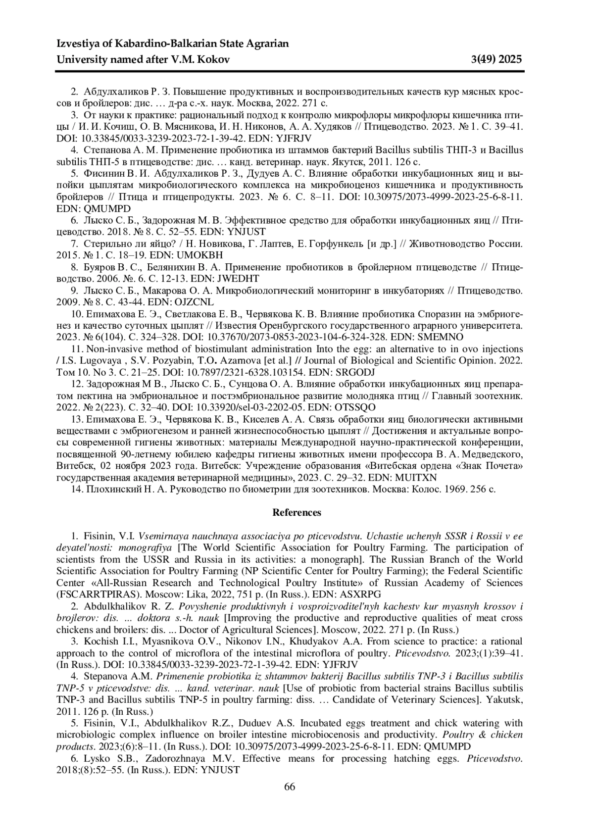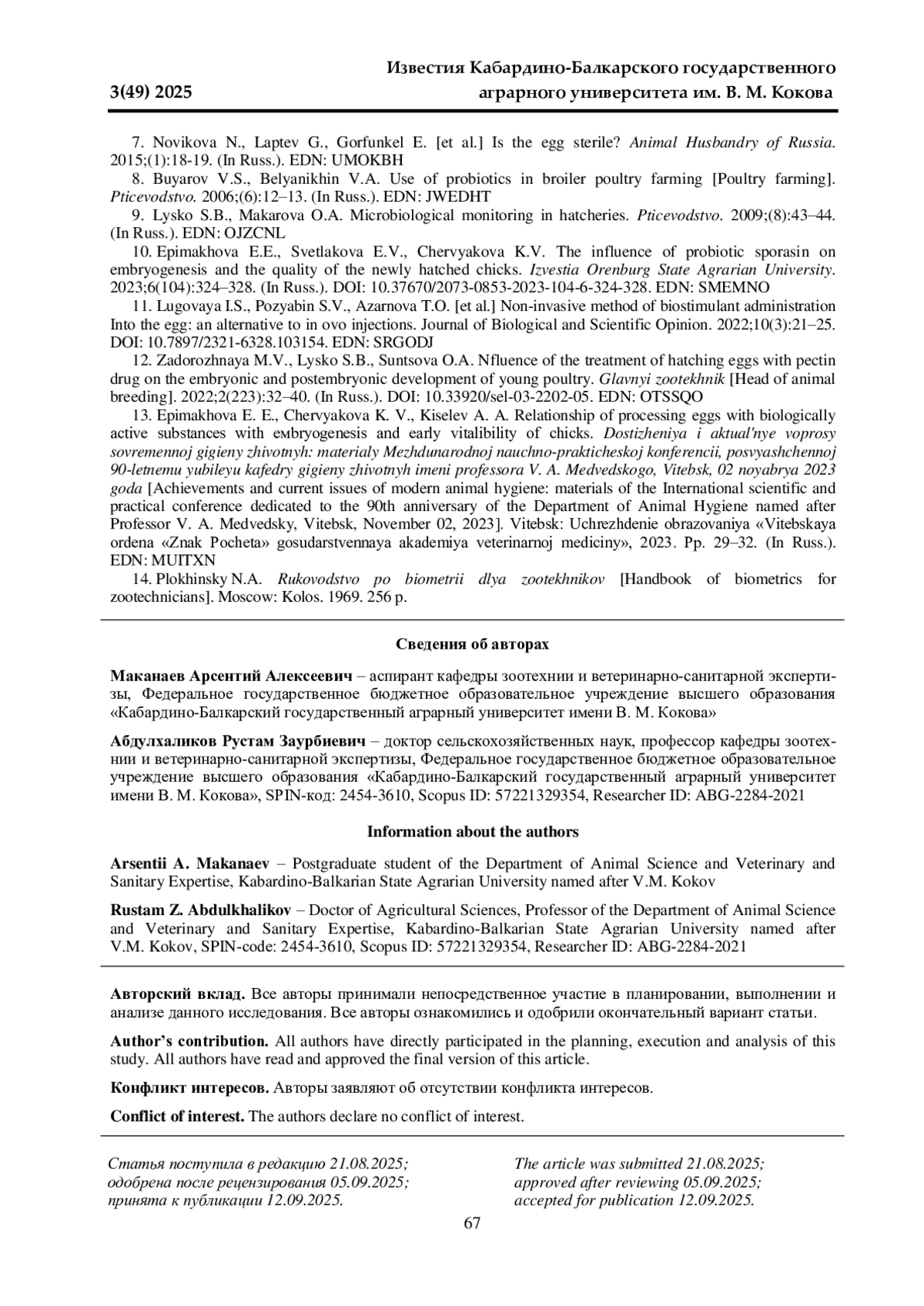 2. 	Абдулхаликов Р. З. Повышение продуктивных и воспроизводительных качеств кур мясных кроссов и бройлеров: дис. … д-ра с.-х. наук. Москва, 2022. 271 с. EDN: EMCJCW