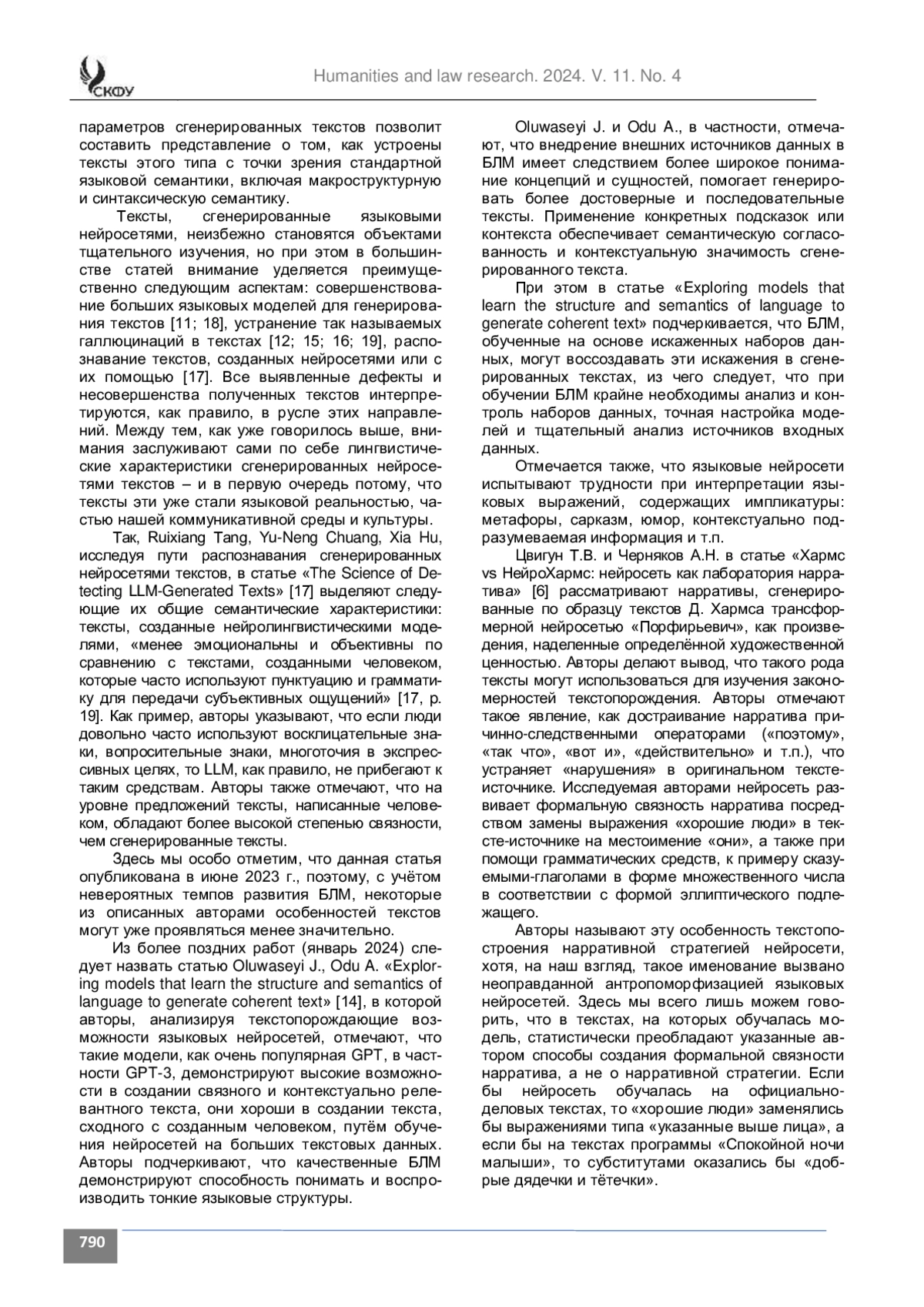 6. Цвигун Т. В., Черняков А. Н. Хармс vs НейроХармс: нейросеть как лаборатория нарратива // Новый филологический вестник. 2023. № 4. С. 80-92.