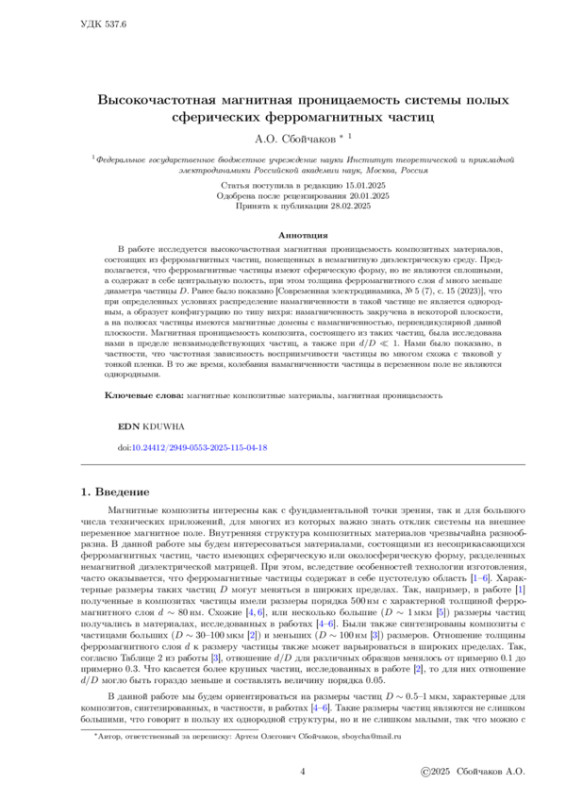 8. 	Сбойчаков А.О. О магнитной энергии ферромагнитной частицы с полостью // Современная электродинамика. 2023. Vol. 5 (7). P. 15.