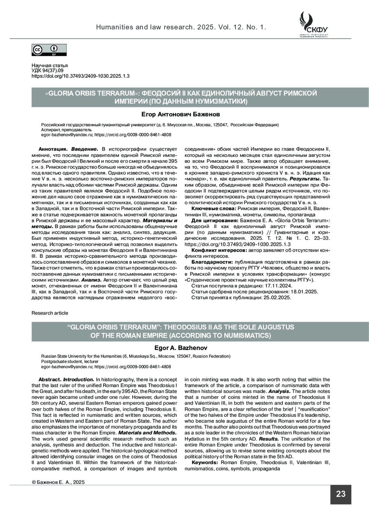 Введение. В историографии существует мнение, что последним правителем единой Римской империи был Феодосий I Великий и после его смерти в начале 395 г. н. э. Римское государство больше никогда не объединялось под властью одного правителя. Однако известно, что в течение V в. н. э. несколько восточно-римских императоров получали власть над обоими частями Римской державы. Одним из таких правителей являлся Феодосий II. Подобное положение дел нашло свое отражение как в нумизматических памятниках, так и в письменных источниках, созданных как как в Западной, так и в Восточной части Римской империи. Также в статье подчеркивается важность монетной пропаганды в Римской державы и ее массовый характер.